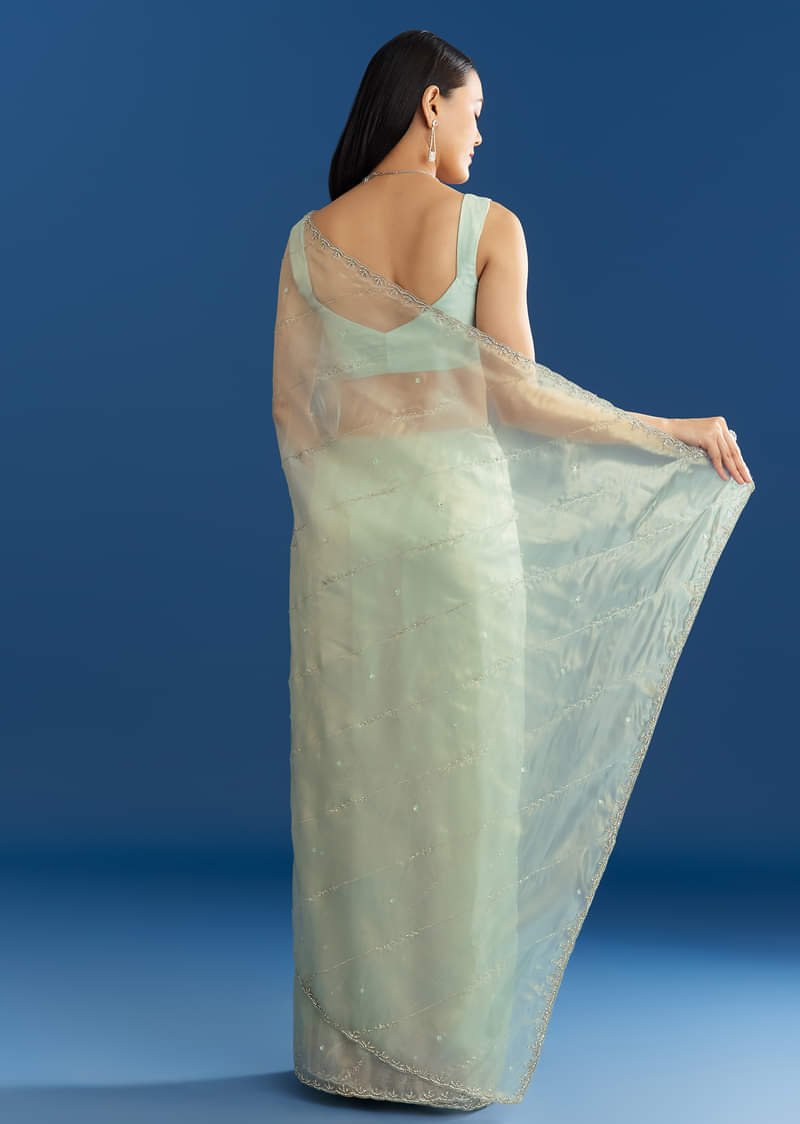 Aqua Blue Organza Tissue Saree With Embellished Border