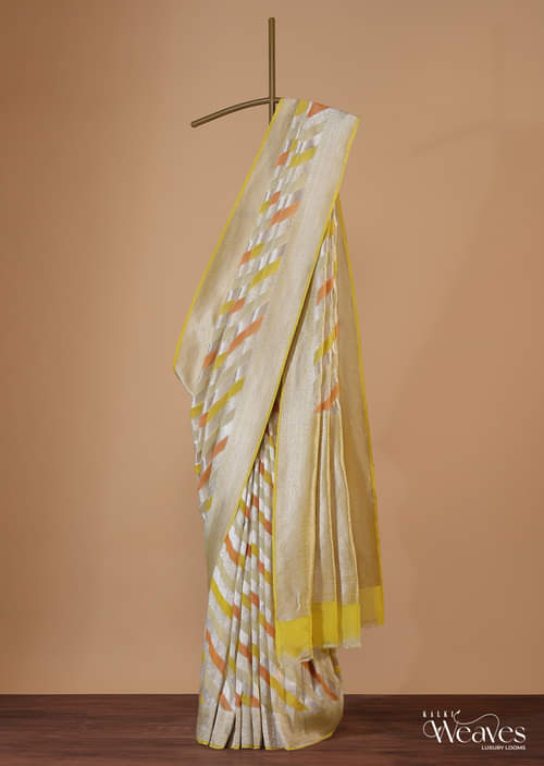 Canary Yellow Saree In Georgette With Striped Banarasi Zari Weave And An Unstitched Blouse
