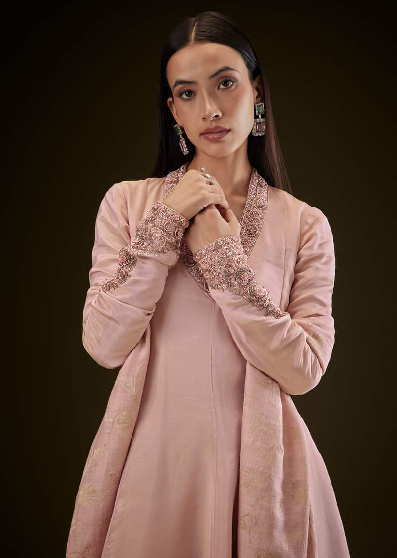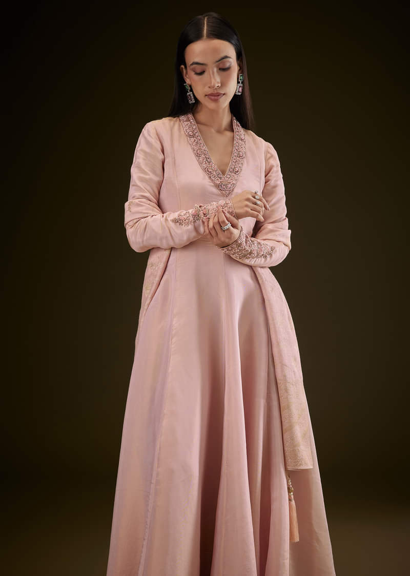 Baby Pink V Neck Anarkali With Printed Dupatta