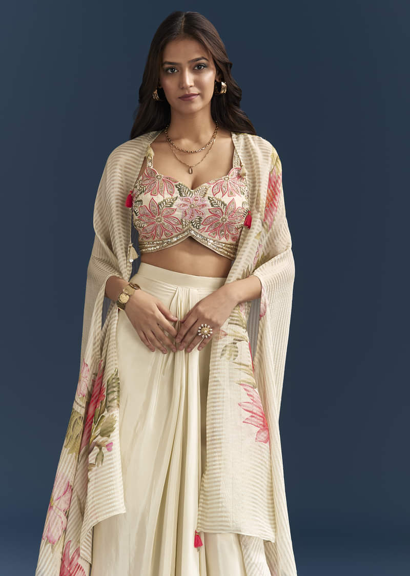 Beige Crop Top Skirt Set With Resham Work And Floral Cape