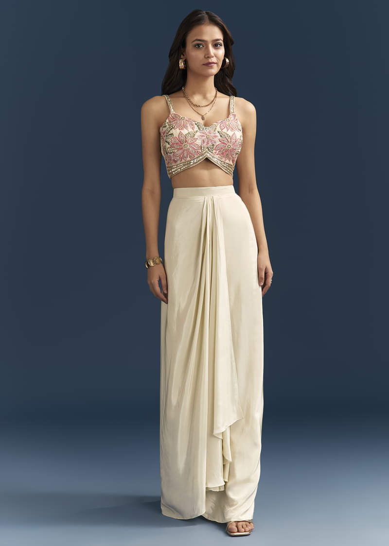 - Product Speciality : This beige crop top and skirt set redefines fusion style with intricate resham embroidery, a sleeveless crop top, and a breezy floral print cape. Perfect for haldi, mehendi, or festive brunches. Awarded as the Most Trusted Brand, we're delivering styles you love, just as promised.