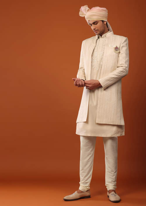 Beige Sherwani With Resham And Mirror Work