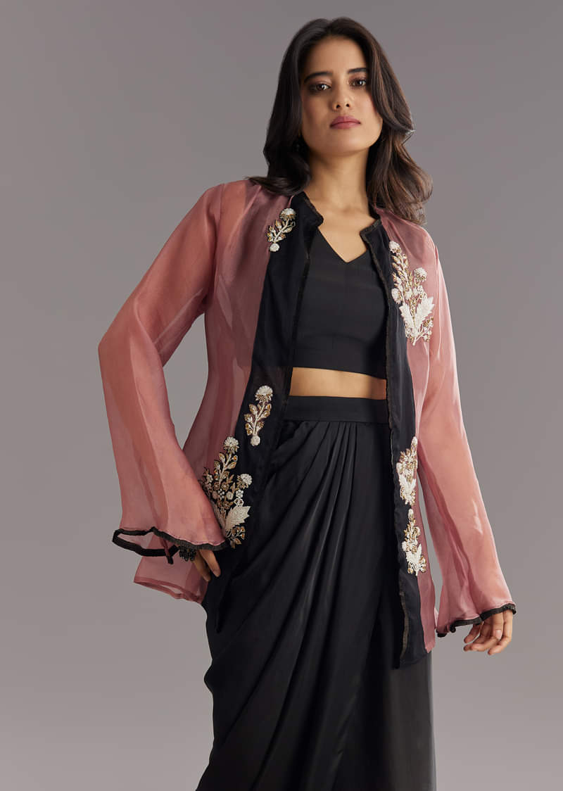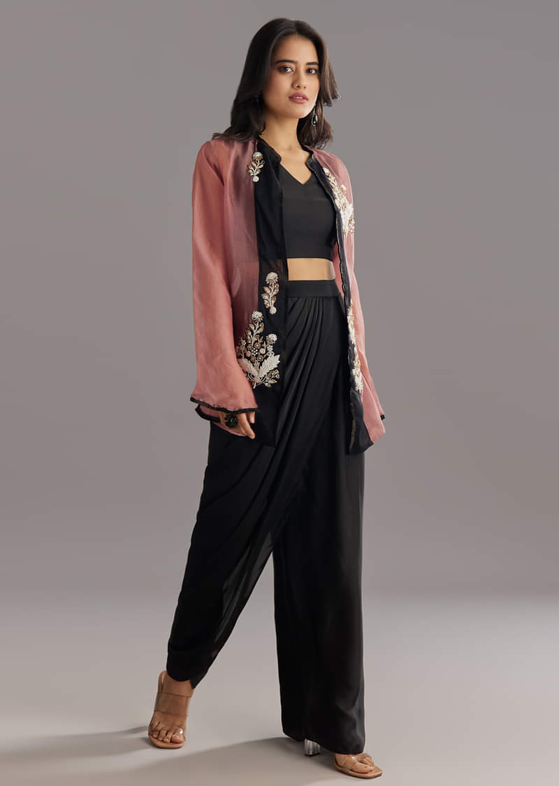 Black Organza Jacket and Satin Dhoti Palazzo Set With Zardosi Embroidery