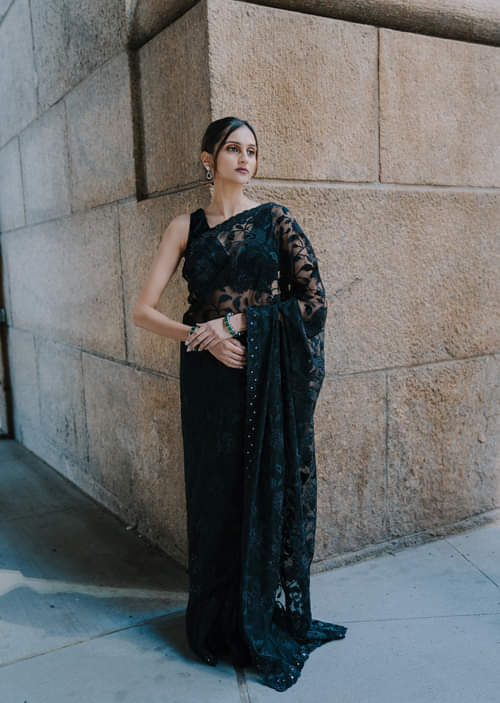 Black Net Saree With Floral Threadwork And Unstitched Blouse Piece