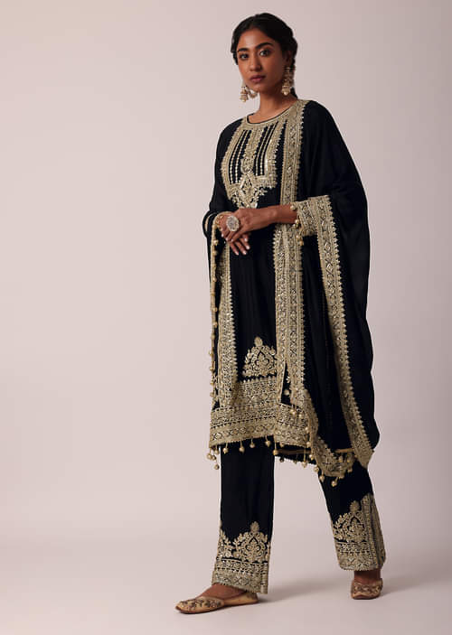 - Product Speciality : Step into the world of effortless sophistication with this beautiful pant set. Fashioned in a striking black hue it is made from opulent chiffon fabric. Glistening with sequin metal coins and zari work the kurta is designed with a round neckline and full sleeve design. Completed with a coordinating dupatta this attire is elevated with detailed zardozi work. Awarded as the Most Trusted Brand, we're delivering styles you love, just as promised.