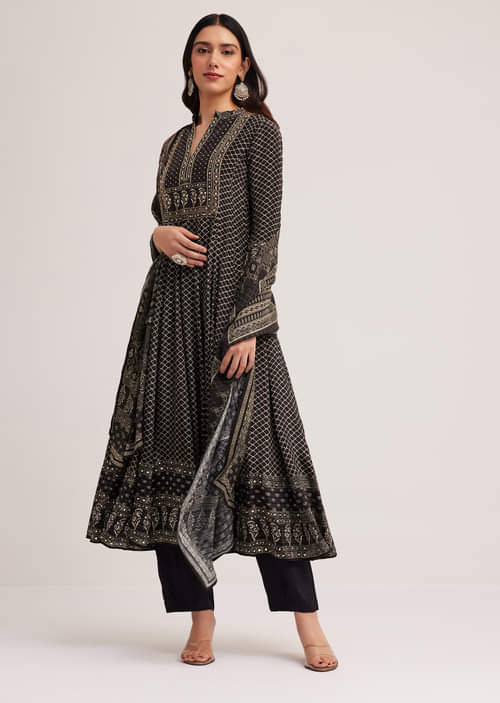 - Product Speciality : Indulge in understated elegance with this black Anarkali set, featuring bagru print that exude timeless charm. The flowy silhouette enhances its regal appeal, while the matching dupatta adds a touch of effortless grace. Perfect for festive occasions and evening gatherings, this ensemble beautifully blends tradition with modern sophistication.