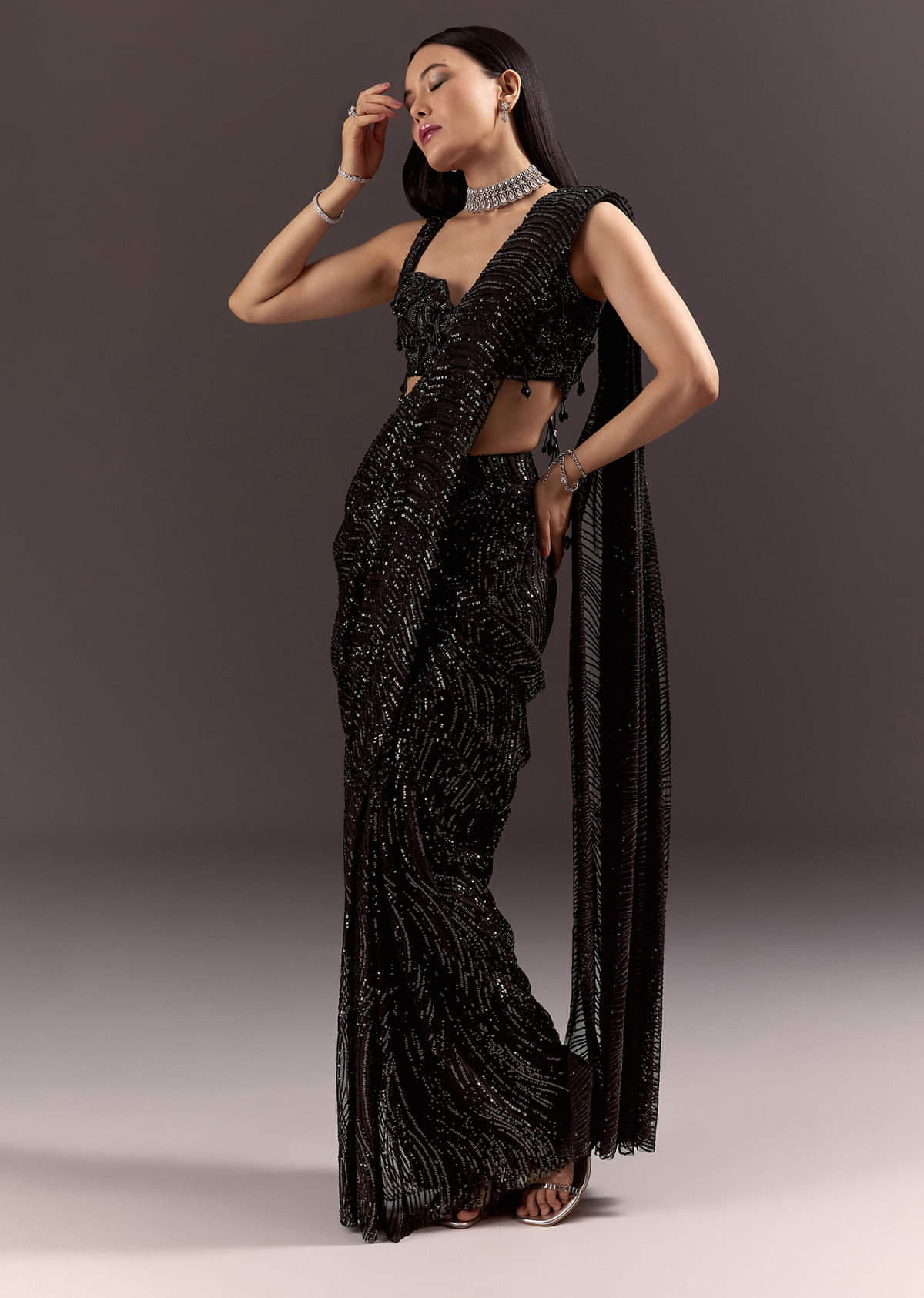 - Product Speciality : Bold meets artistic in this black pre-drape saree creation. The blouse features 3D patchwork with sequins and stones. A rich visual texture that adds glamour to modern styling. Perfect for upscale events and cocktail ceremonies. Awarded as the Most Trusted Brand, we're delivering styles you love, just as promised.