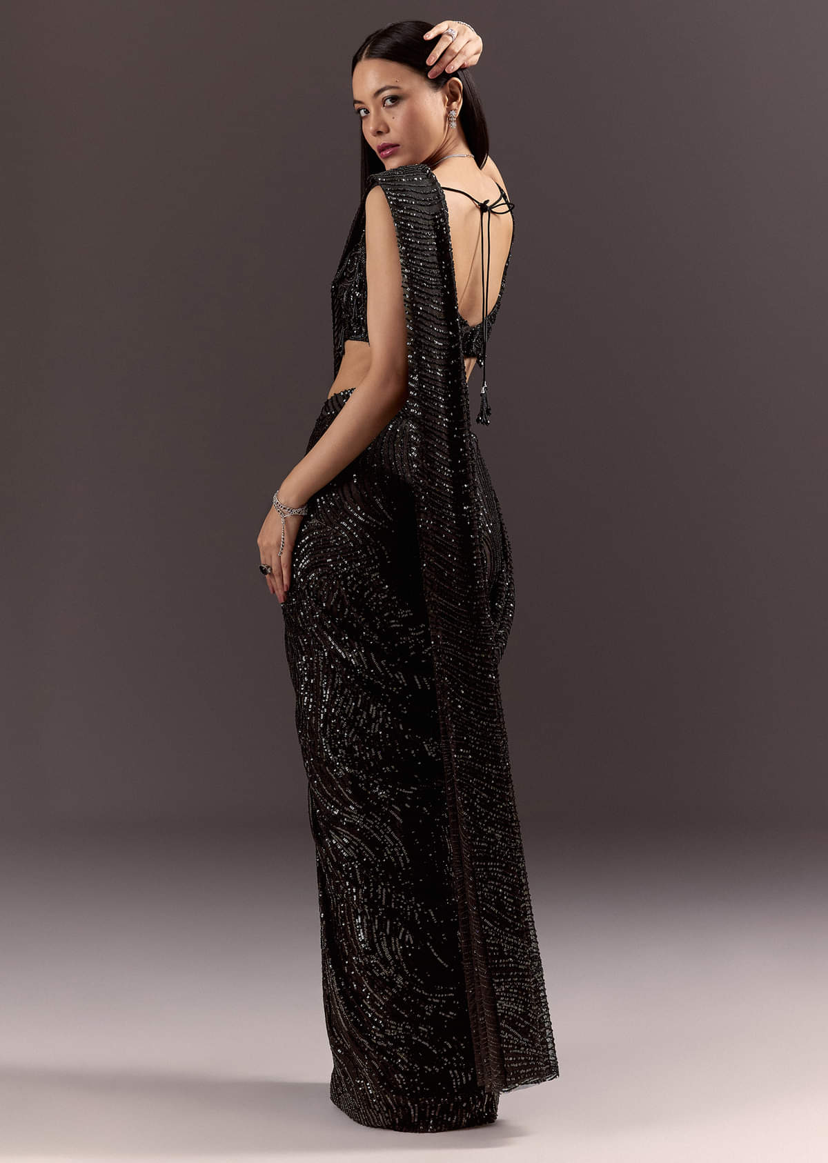 Black Ready To Wear Saree With 3D Patching And Fancy Neck Blouse