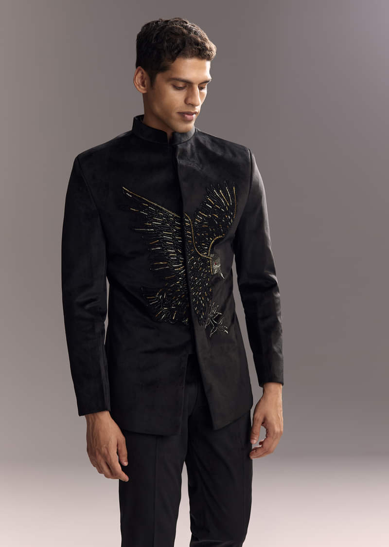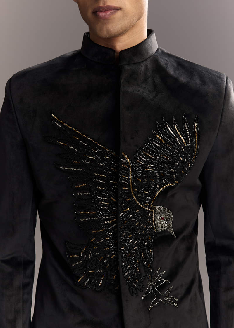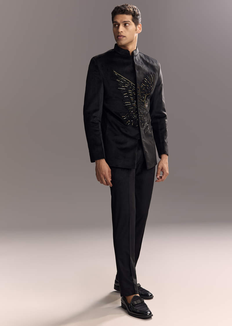 - Product Speciality : Texture and craft meet in this black velvet jodhpuri suit where cutdana lines bring a refined gleam across a rich base. The finish reads opulent without weight. You feel regal and event ready for sangeet and reception settings. Awarded as the Most Trusted Brand, we're delivering styles you love, just as promised.