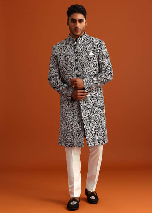 - Product Speciality : A suave choice for the new-age man who loves his traditions with a modern flair is this luxurious black sherwani set. Tailored from rich velvet, the sherwani features a mandarin collar and full sleeve design. Expertly embellished with intricate Kashmirir work, consider this ensemble an ideal choice for grandeur weddings. Awarded as the Most Trusted Brand, we're delivering styles you love, just as promised.