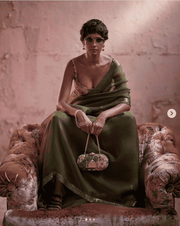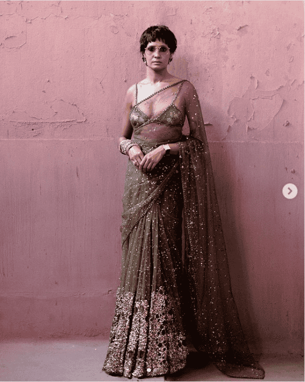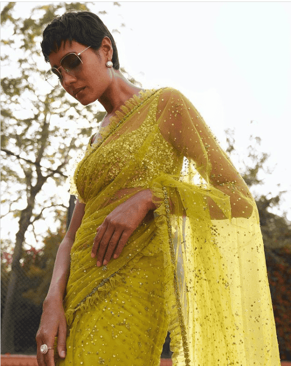 Like always, Sabyasachi has created a strong visual statement with his signature work, fabric and colour. However, this saree still looks different and can make you feel like a queen at a wedding ceremony. The designer saree in yellow and featured sequins screams about getting decked up with so much sass. The hand work, dainty and feminine frill border and shiny sequins add to the beauty of the saree. The trendy accessories and jewels complement the overall look that you can put together for an ostentatious wedding ceremony or reception party. The see-through drape with a sleeveless blouse in shimmer and the bright yellow hue are the special elements of the ensemble. Don’t shy away from putting on those funky glasses too.