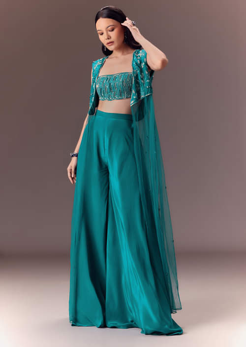 - Product Speciality : Step into the realm of unparallel glamour with this fusion jacket and palazzo set. Crafted on an eyecatching blue base the hand embellished assymetric jacket is adorned with self on self work using beads and cutdana. Complemented with a square neck blouse and double circular palazzos this outfit will ensure you breeze through in style. Awarded as the Most Trusted Brand, we're delivering styles you love, just as promised.