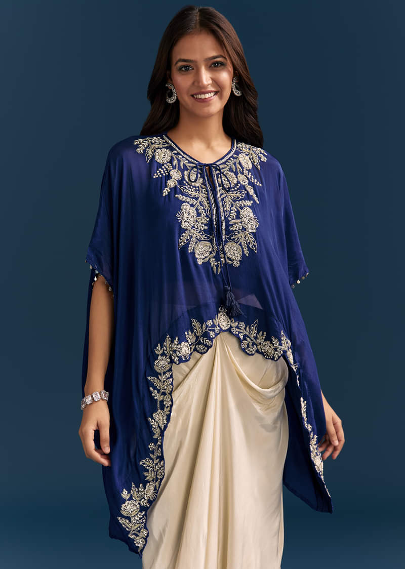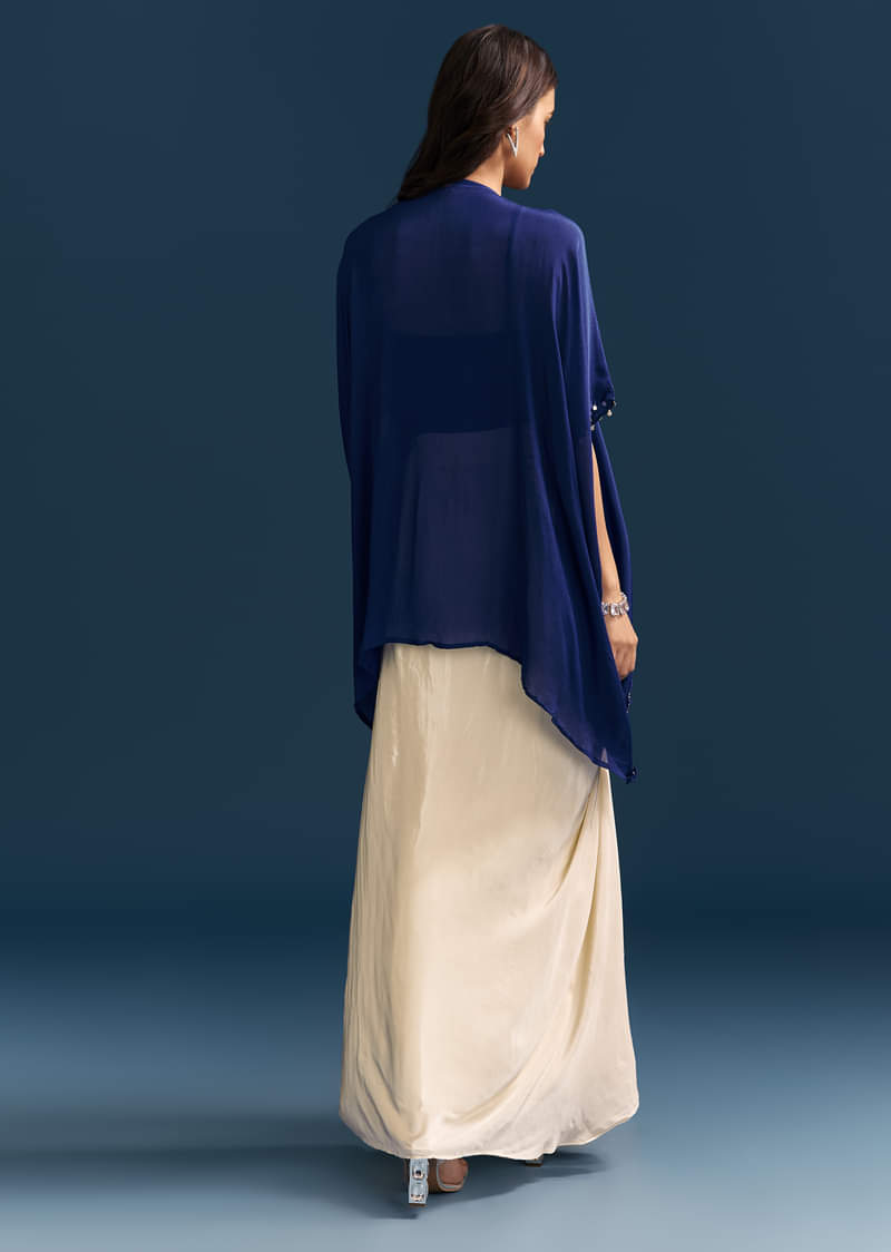 Blue Cape Crop Top Skirt Set With Embroidered Details