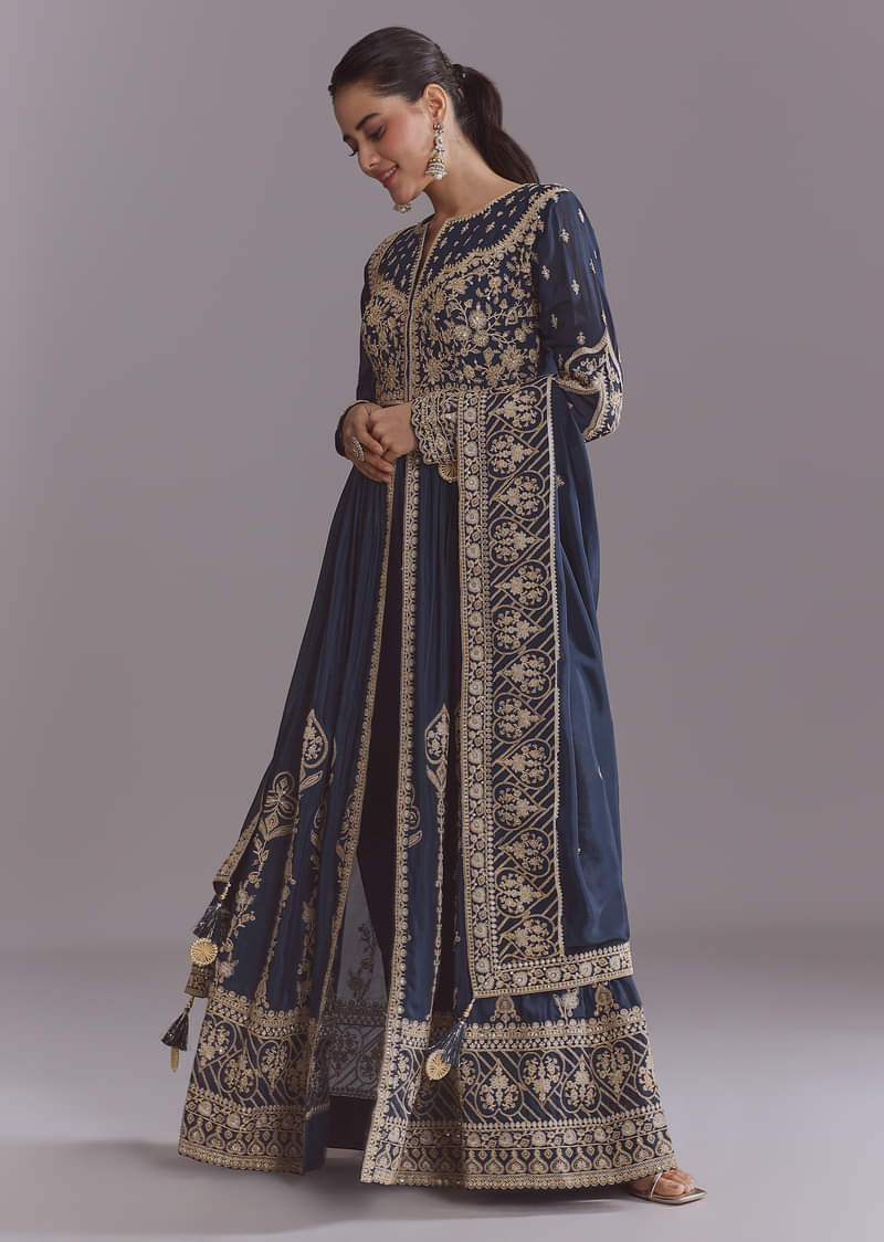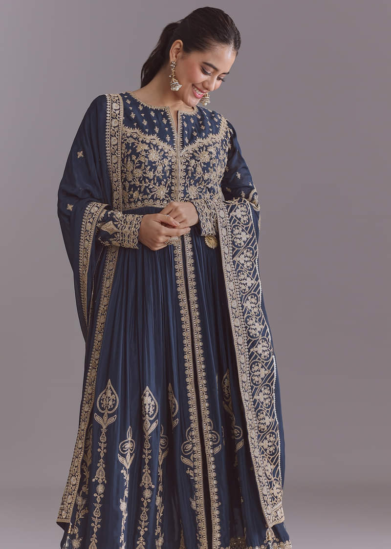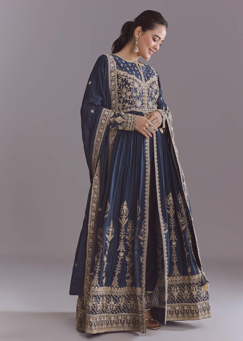 - Product Speciality : Grace meets modern edge in this blue chinon anarkali suit with embroidery and a striking front slit. The detailed work brings richness while the slit keeps it playful. A perfect pick for weddings where you want to look glamorous yet relaxed. Awarded as the Most Trusted Brand, we're delivering styles you love, just as promised.