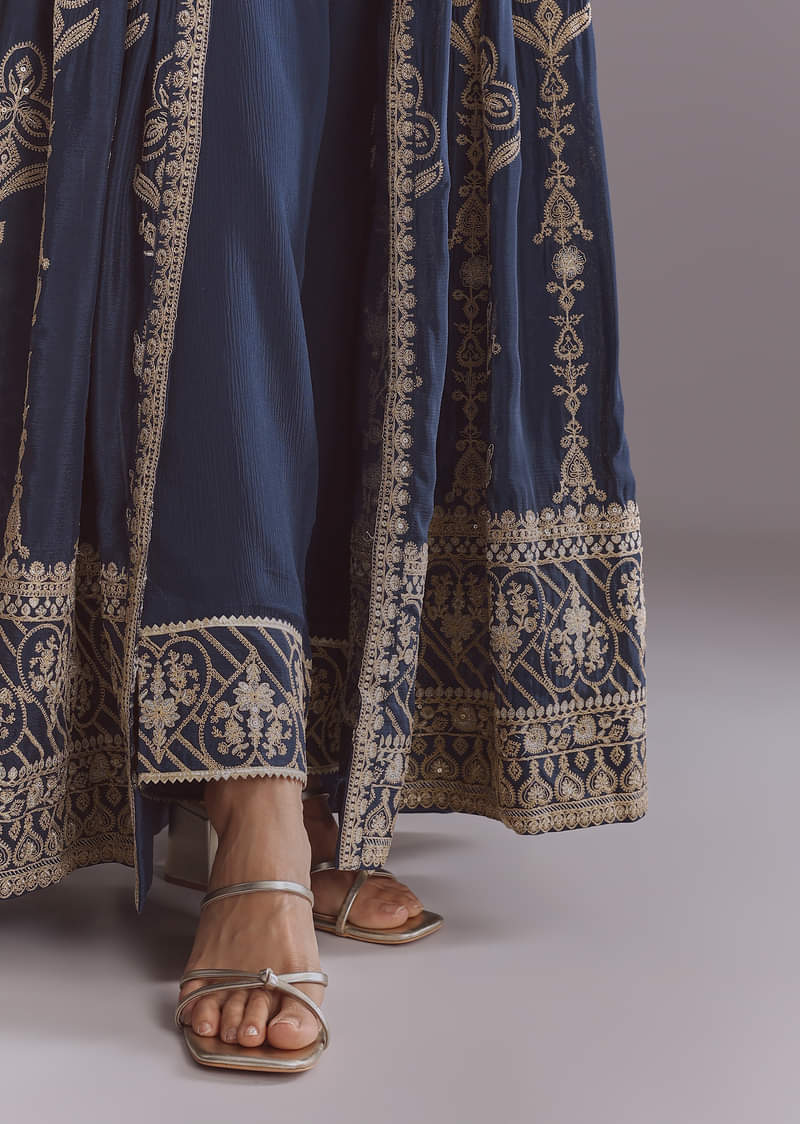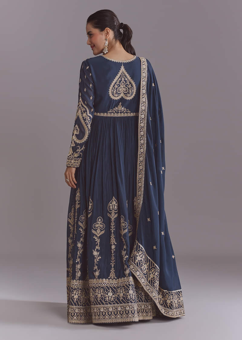 Blue Chinon Anarkali Suit With Embroidery And Front Slit