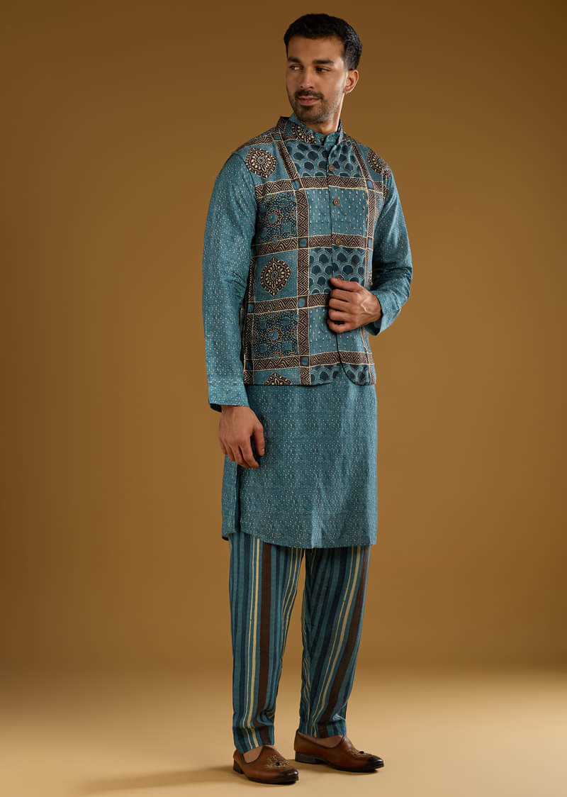 - Product Speciality : Craft meets pattern as this blue linen men’s kurta jacket set pairs a hand-block ajrakh jacket with leheriya print pants for subtle contrast. The mix feels rooted yet fresh in photos and in person. You look lively and well put together for festive, pooja, and mehendi moments. Awarded as the Most Trusted Brand, we're delivering styles you love, just as promised.