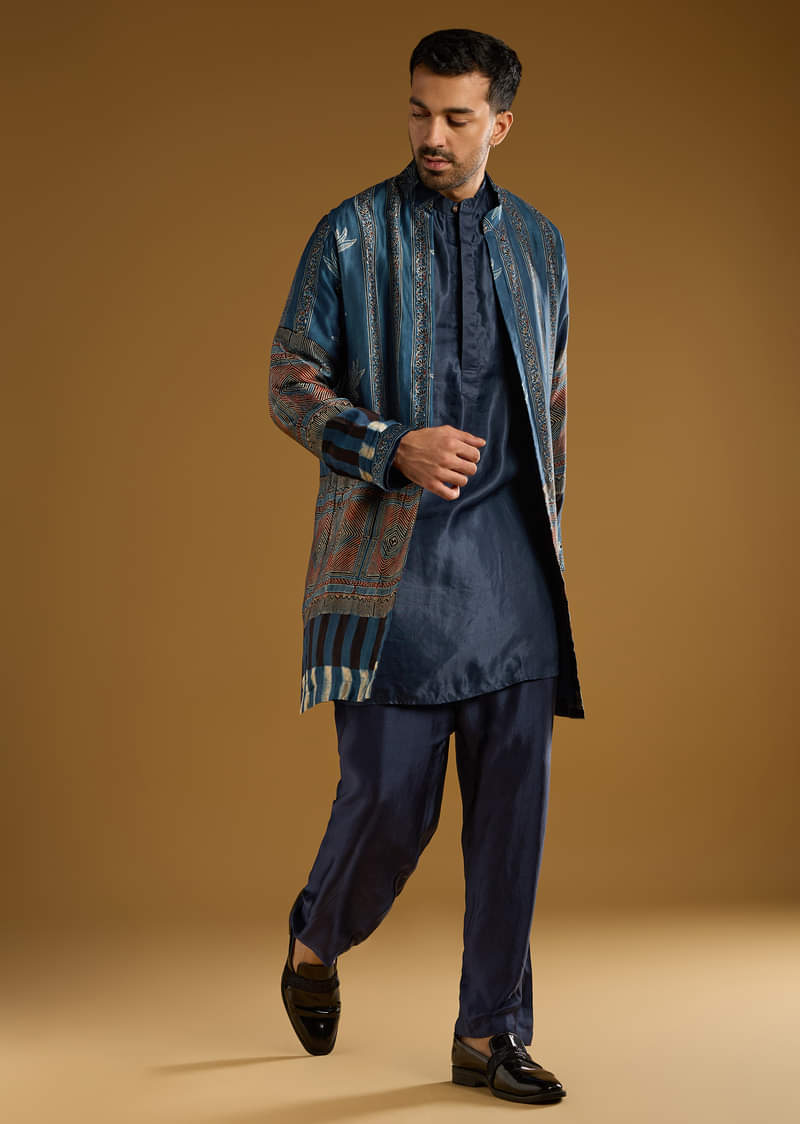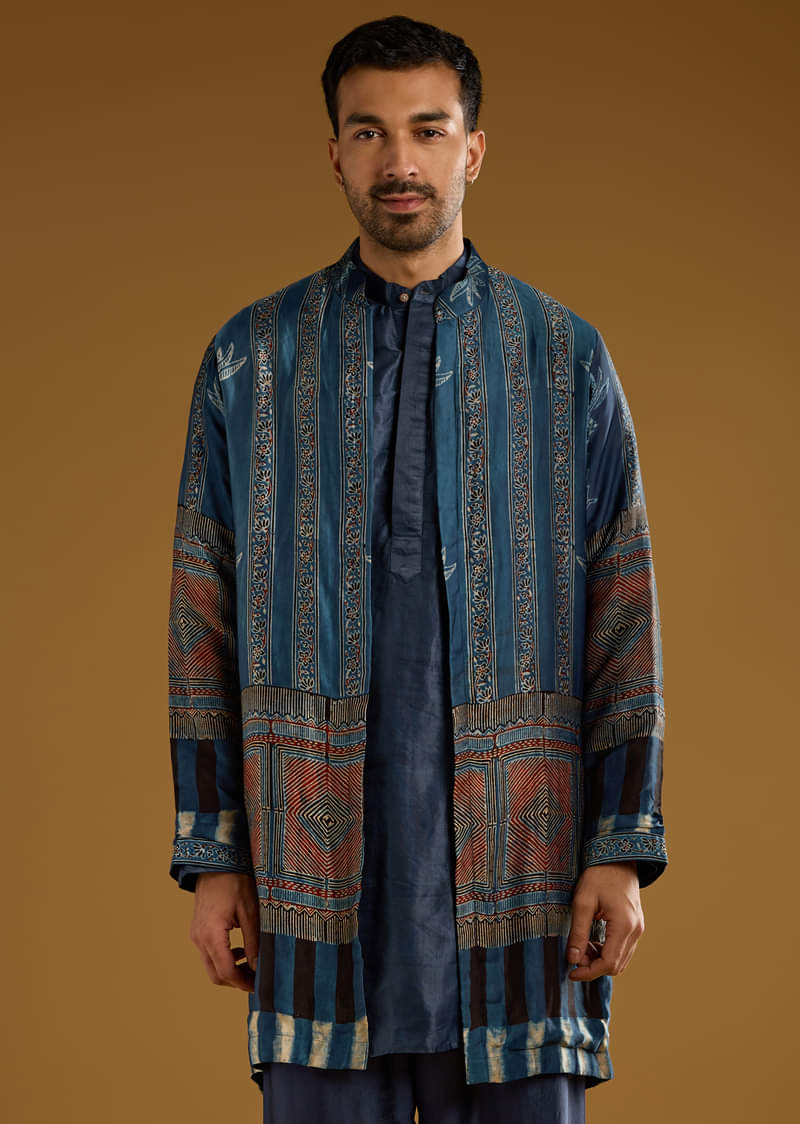 Blue Modal Linen Kurta Jacket Set For Men With Hand Block Ajrakh Print