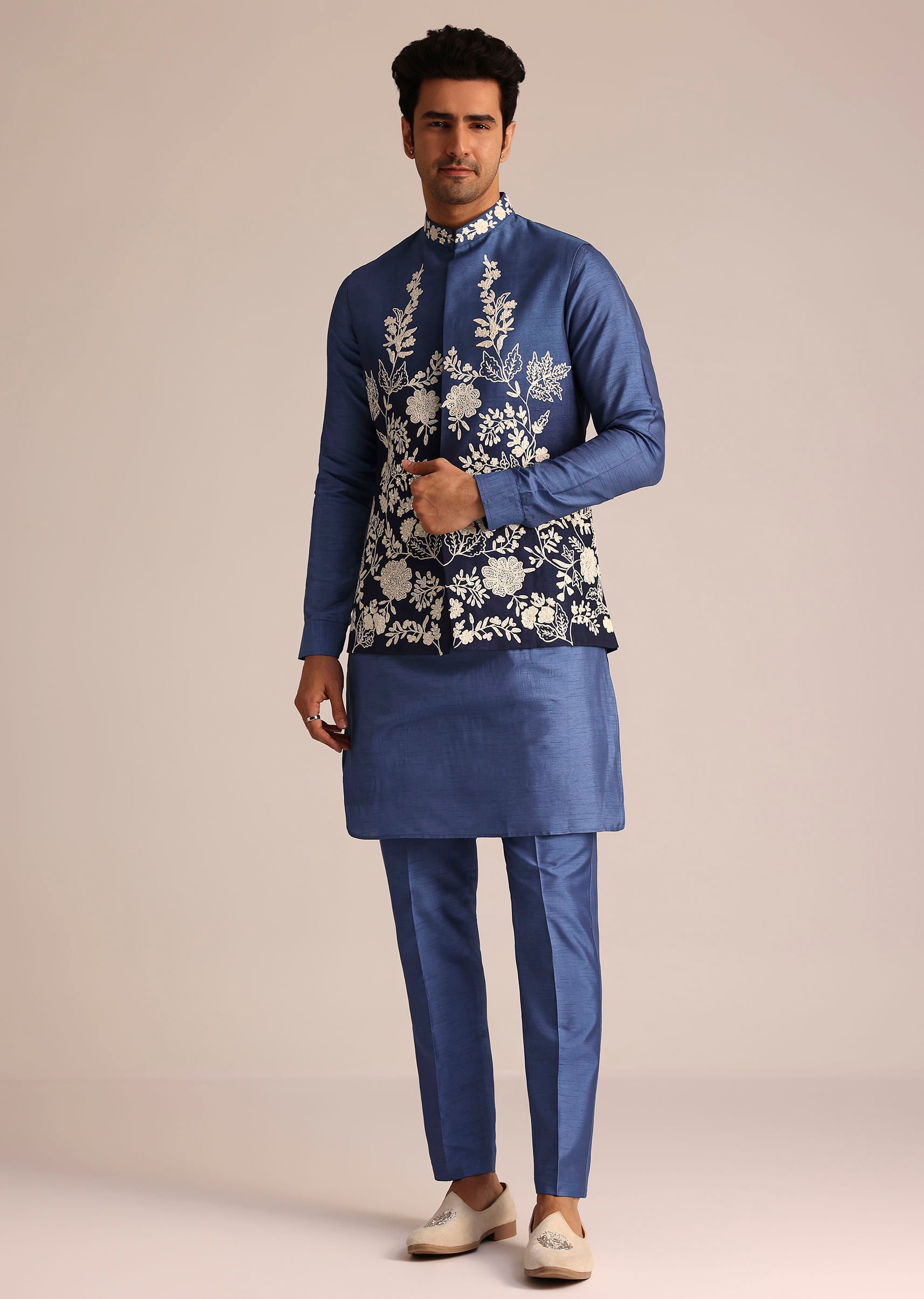 Make A Lasting Impression With This Blue Silk Ensemble Featuring A Beautifully Embroidered Jacket Adorned With Delicate Thread And Dori Work. Paired With A Sleek Kurta And Tailored Bottom This... More Product Details