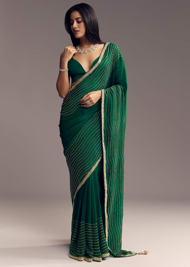 - Product Speciality : This bottle green organza saree features elegant scallop borders and horizontal wavy lines embroidered with shimmering cut dana and stones. A blend of nature and luxe. Awarded as the Most Trusted Brand, we're delivering styles you love, just as promised.