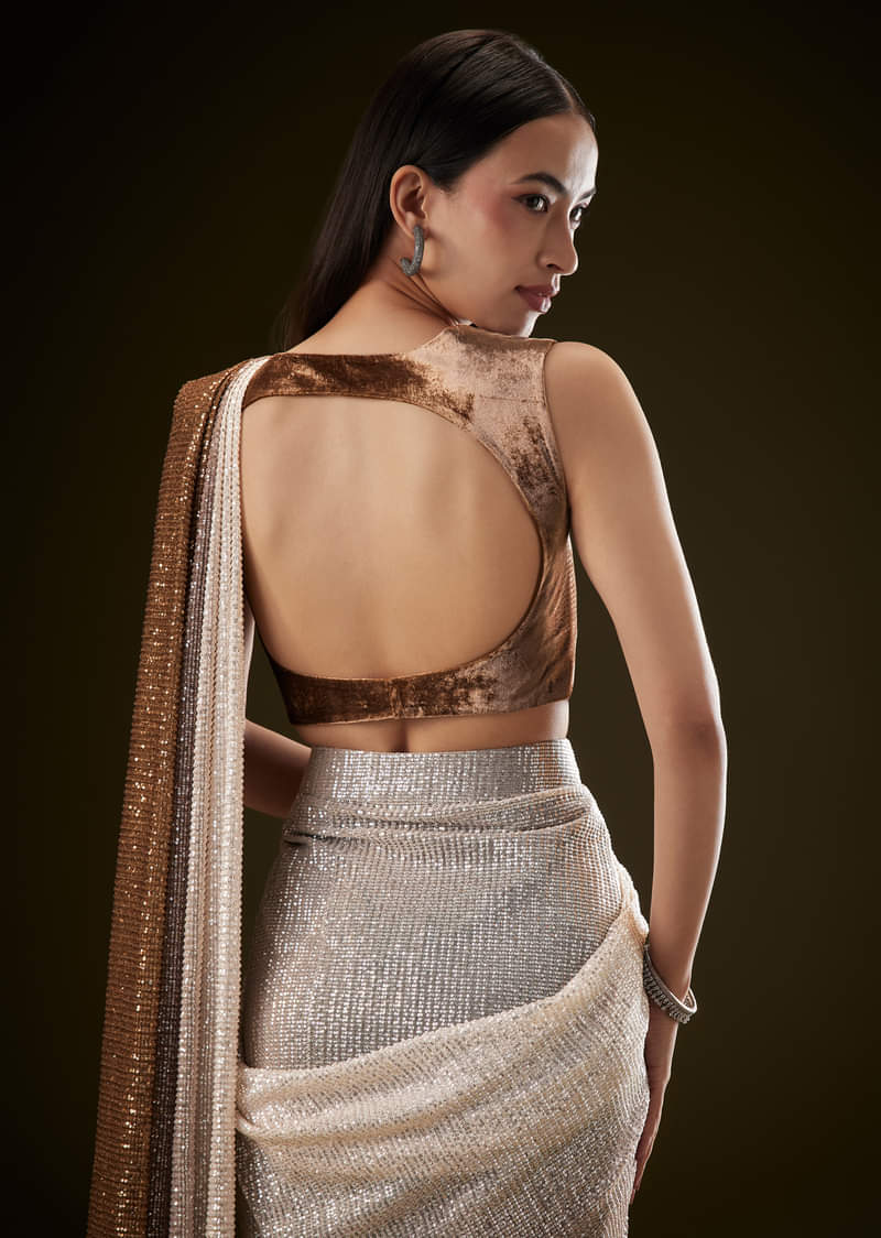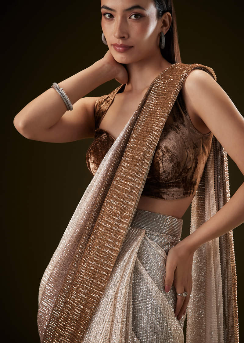 Brown Ombre Sequence Ready To Wear Saree With Velvet Blouse