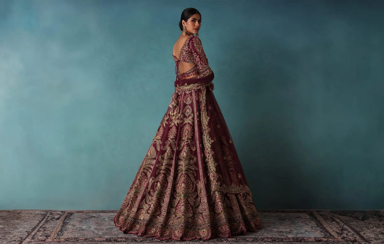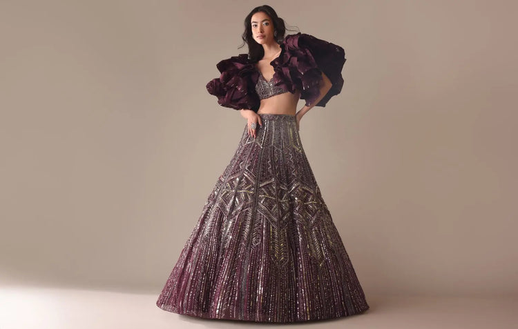 Mulberry Purple Wrinkle Satin Lehenga With Swarovski Crystals