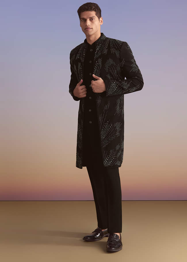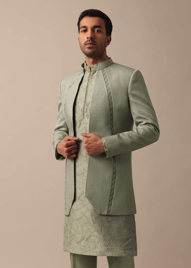 Picking the right pre-wedding outfit can make a groom stand out. While sherwanis and suits are the apt and royal choice for the main wedding day, the groom can go for fresh and fun looks for pre-wedding events like haldi and mehendi. Light-weighted kurta with jacket for men in shades like yellow and off-white can be great choices as haldi outfit for men. Mens mehendi outfit can revolve around traditional green, yellow, or beige tones. The Nehru jacket set or Indo-Western dhoti kurta set for men in bright and ethnic hues can be an excellent choice for mehendi. Those who are a bit experimental can opt for designer kurtas in various cuts and styles. Men can ensure that the color of the jacket or stole complements the kurta design for a cohesive appearance. For a sangeet ceremony that thrives on fun and dance, men can opt for trendy asymmetrical kurta sets, bandi jacket sets in floral prints, or cowl kurta sets. For engagement, men can go for a versatile piece of clothing like an Indo-western Jodhpuri sherwani or tuxedo in dark or neutral hues. Indian groom wedding dress for engagement can also comprise bandhgala suits in silk or velvet, depending upon the season.