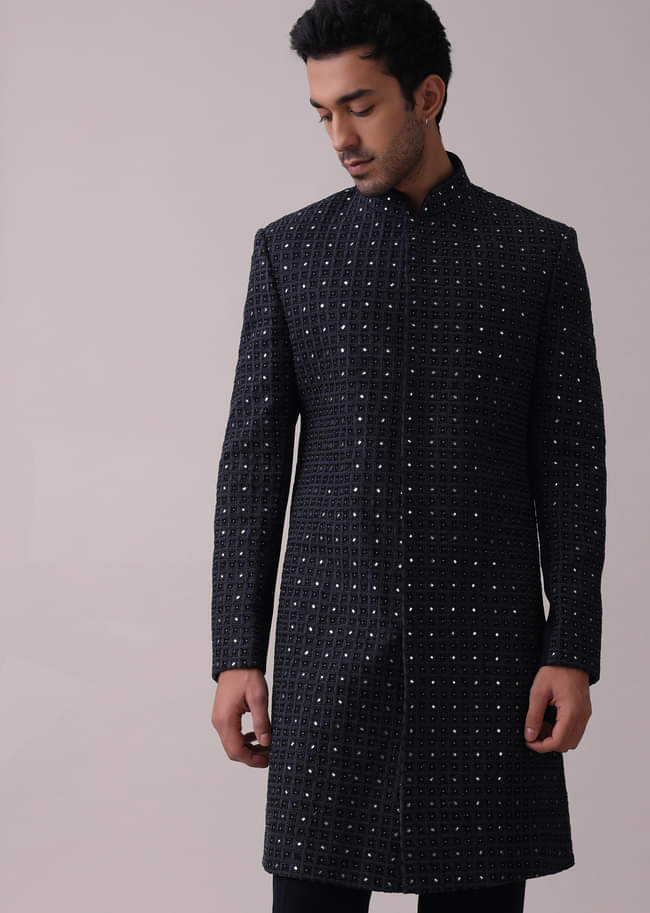 Sherwani in any form and version looks royal. Glitter, glimmer, and splendour is what an Indian sherwani oozes out. But when it is transformed to an Indo-western sherwani the fusion vibes are just great. Kurta and jacket, angrakha style, side button panel, asymmetrical kurta and jacket set are few Indo western sherwani looks that men can try at weddings or their own D-day.Achkan Suits