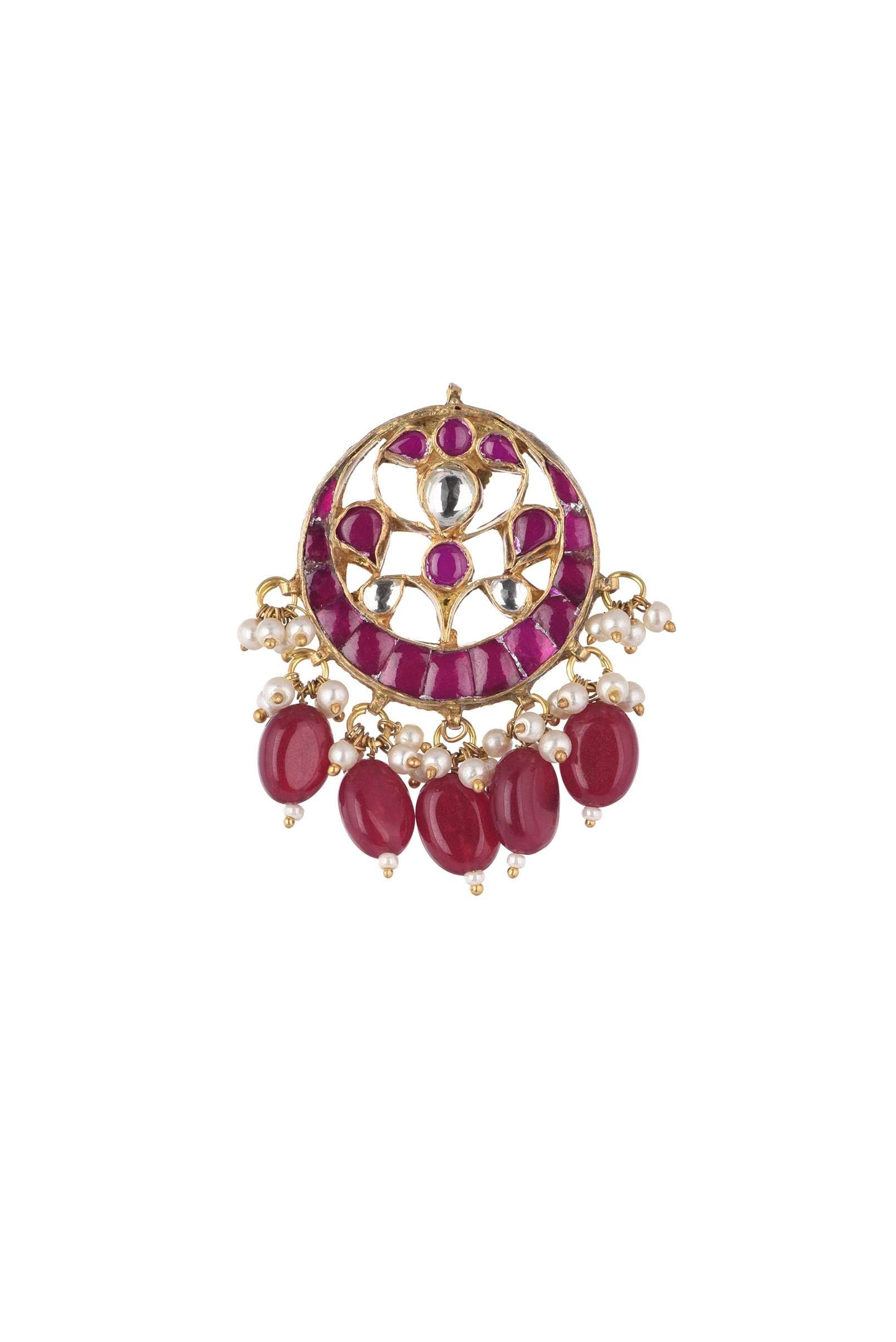 - The long necklace features stunning red meenakari work beautifully complemented by lustrous pearls.