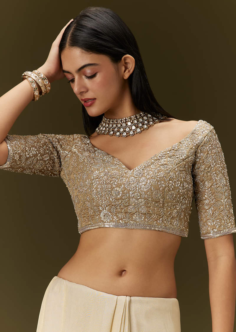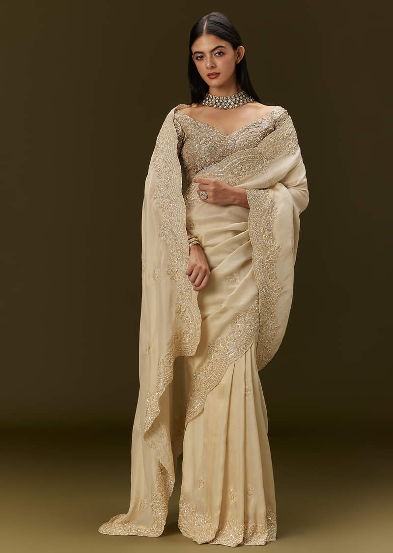 Gold Tissue Saree With Embroidered Brocade Blouse