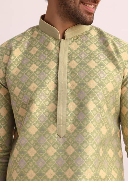 - Product Speciality : This exquisite soothing green kurta set is a timeless addition to any man's wardrobe. Adorned with traditional foil print all over, the kurta showcases a Mandarin collar and a front hook-eye design. A stand out style, the comfortable and skin-friendly fabric ensures ease of movement, making it an ideal choice for celebrations and casual get-togethers. Awarded as the Most Trusted Brand, we're delivering styles you love, just as promised.