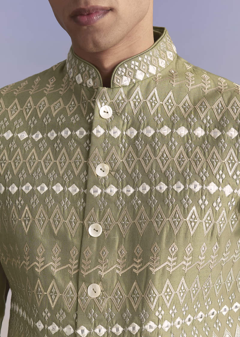 Green Silk Kurta Jacket Set For Men With Intricate Hand Embroidery