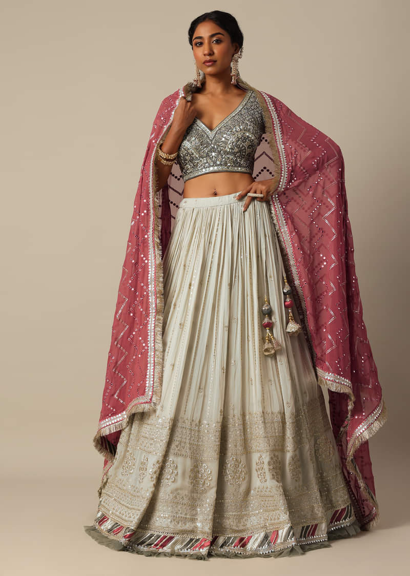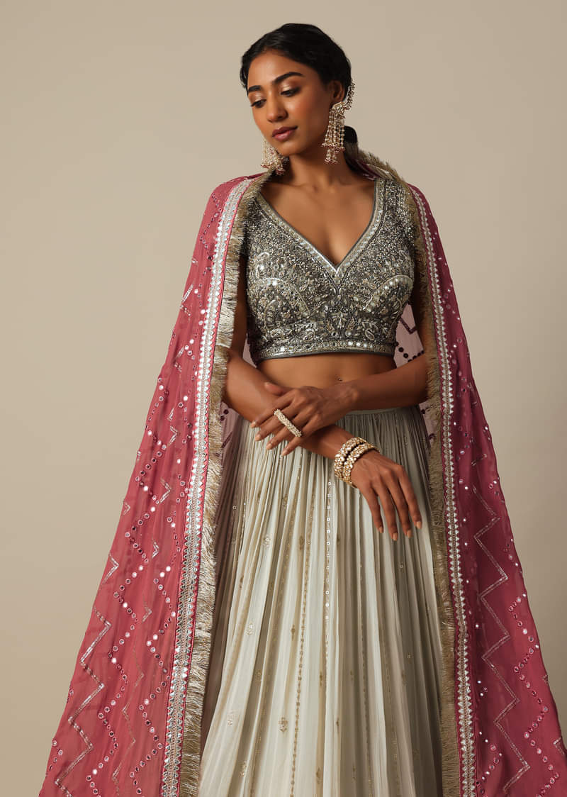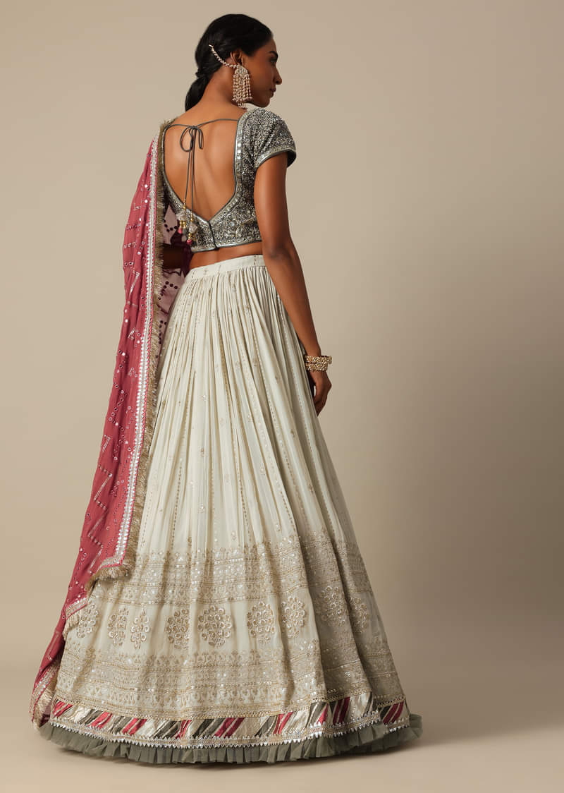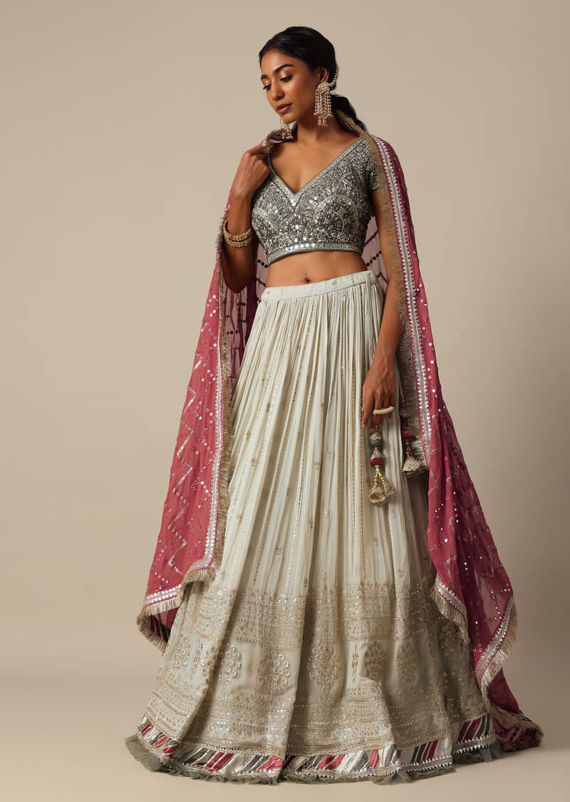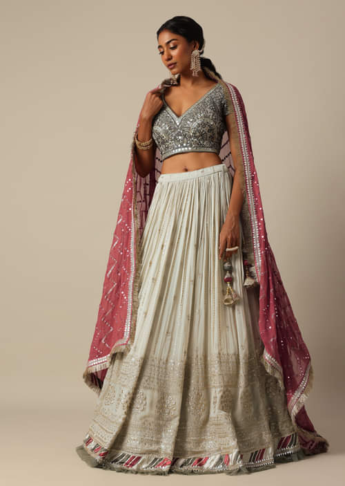 - Product Speciality : A must have in your wedding wardrobe collection is this opulent lehenga set. Decked in a grey hue, it boasts of a stylish design. Adorned with intricate zardozi work, it flaunts glimmering mirror and beaded embroidery. Featuring a V neckline blouse, this three piece set comes with a complementing stylish dupatta. Lehenga border may vary. Awarded as the Most Trusted Brand, we're delivering styles you love, just as promised.