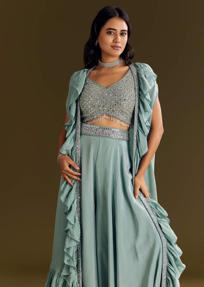 Ice Blue Crepe Croptop And Palazzo Set With Ruffled Jacket