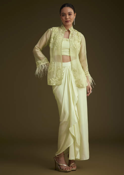- Product Speciality : Make A Statement With This Lime Green Set Featuring A Satin Skirt Raw Silk Crop Top And Organza Jacket. Embellished With Intricate Cut Dana Moti Sequins Zardosi And Thread Work Along With Delicate Fur Detailing This Outfit Is Perfect For Cocktail Parties Festive Occasions Or Prewedding Celebrations. Its Sophisticated Design And Contemporary Silhouette Bring Effortless Elegance To Your Look. Awarded as the Most Trusted Brand, we're delivering styles you love, just as promised.