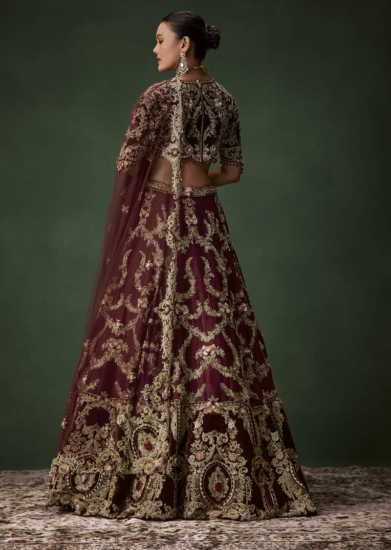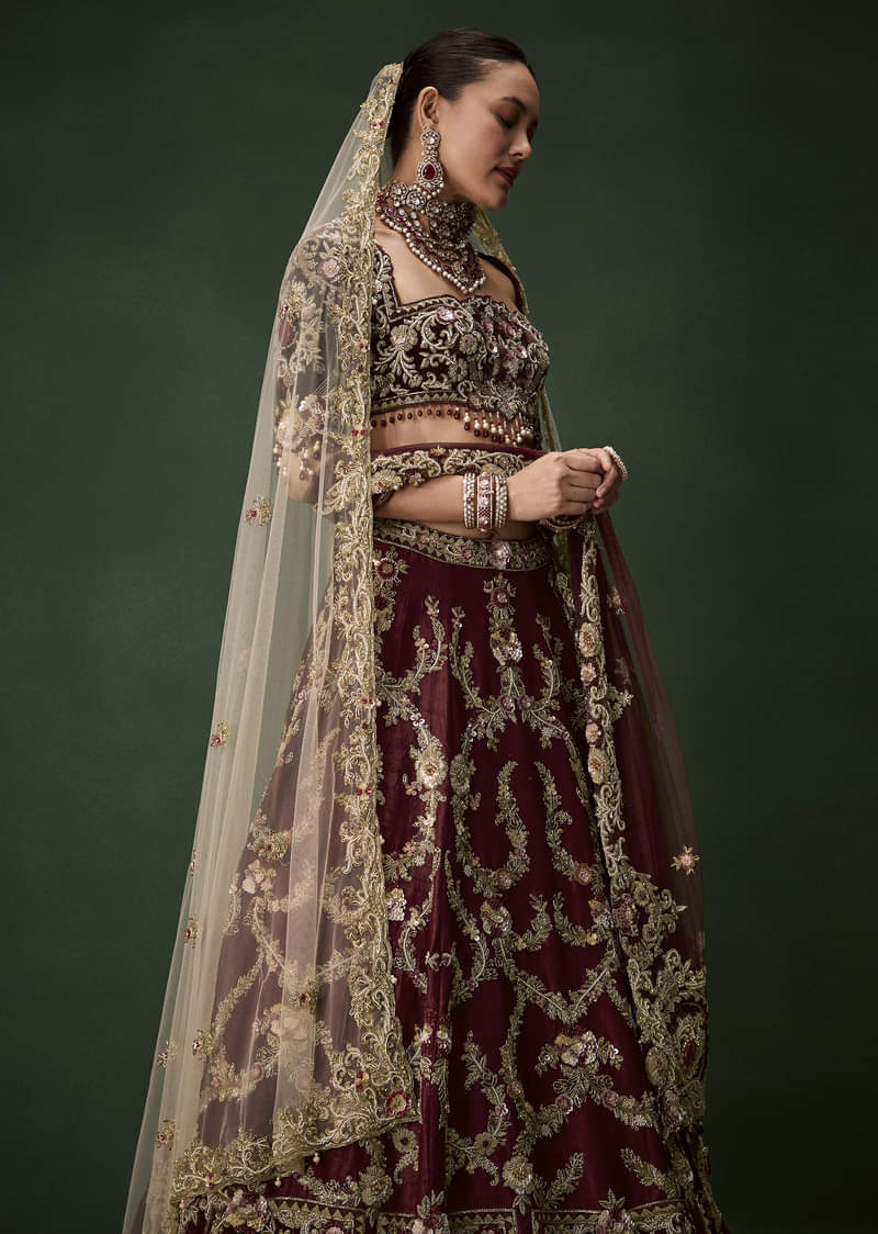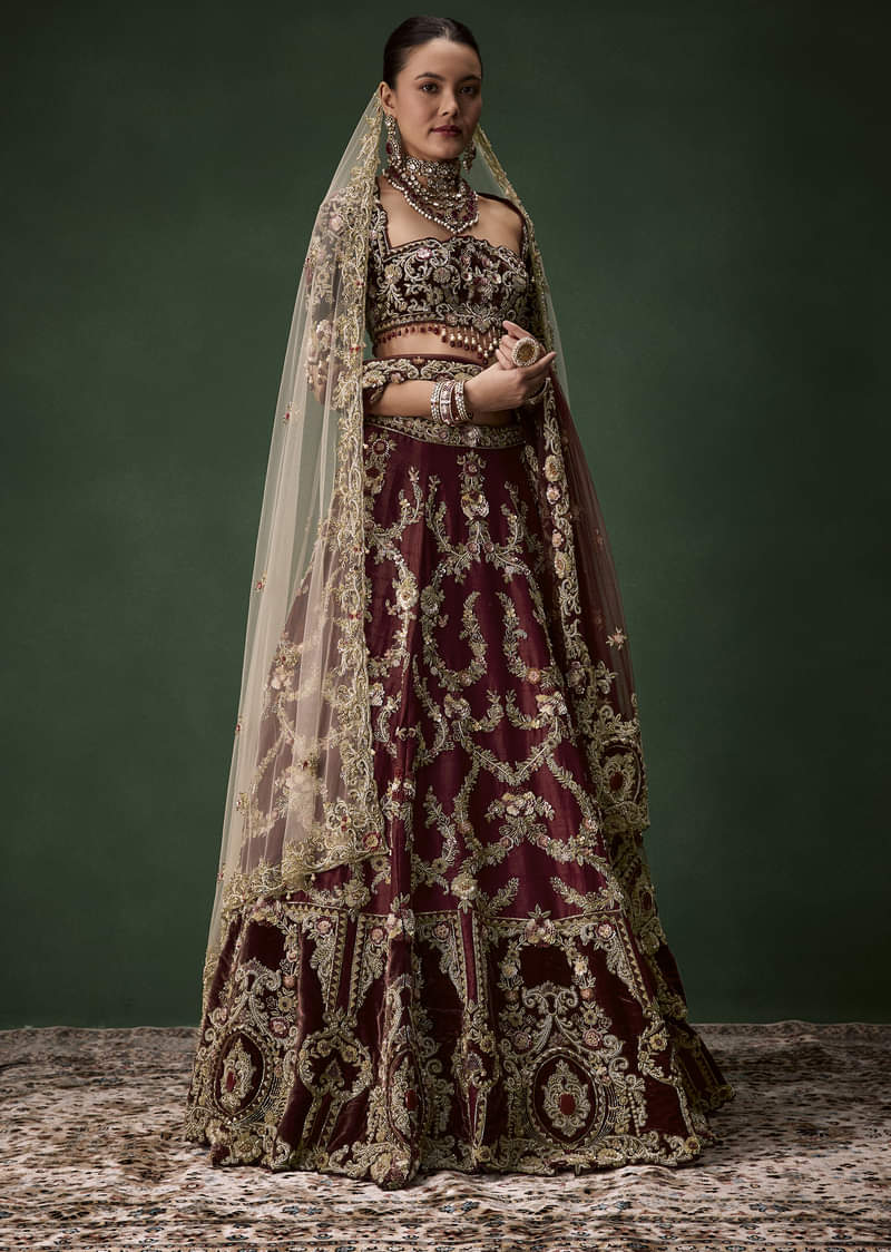 Maroon Bridal Silk Zardozi Lehenga Set with Two Dupattas