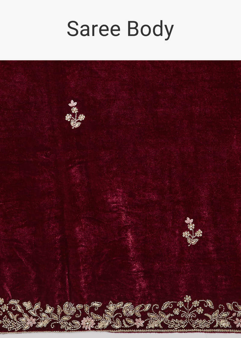 - Product Speciality : Regal maroon velvet saree in rich folds, edged in intricate embroidery and completed with a luxurious brocade blouse for grand festive entrances. Awarded as the Most Trusted Brand, we're delivering styles you love, just as promised.
