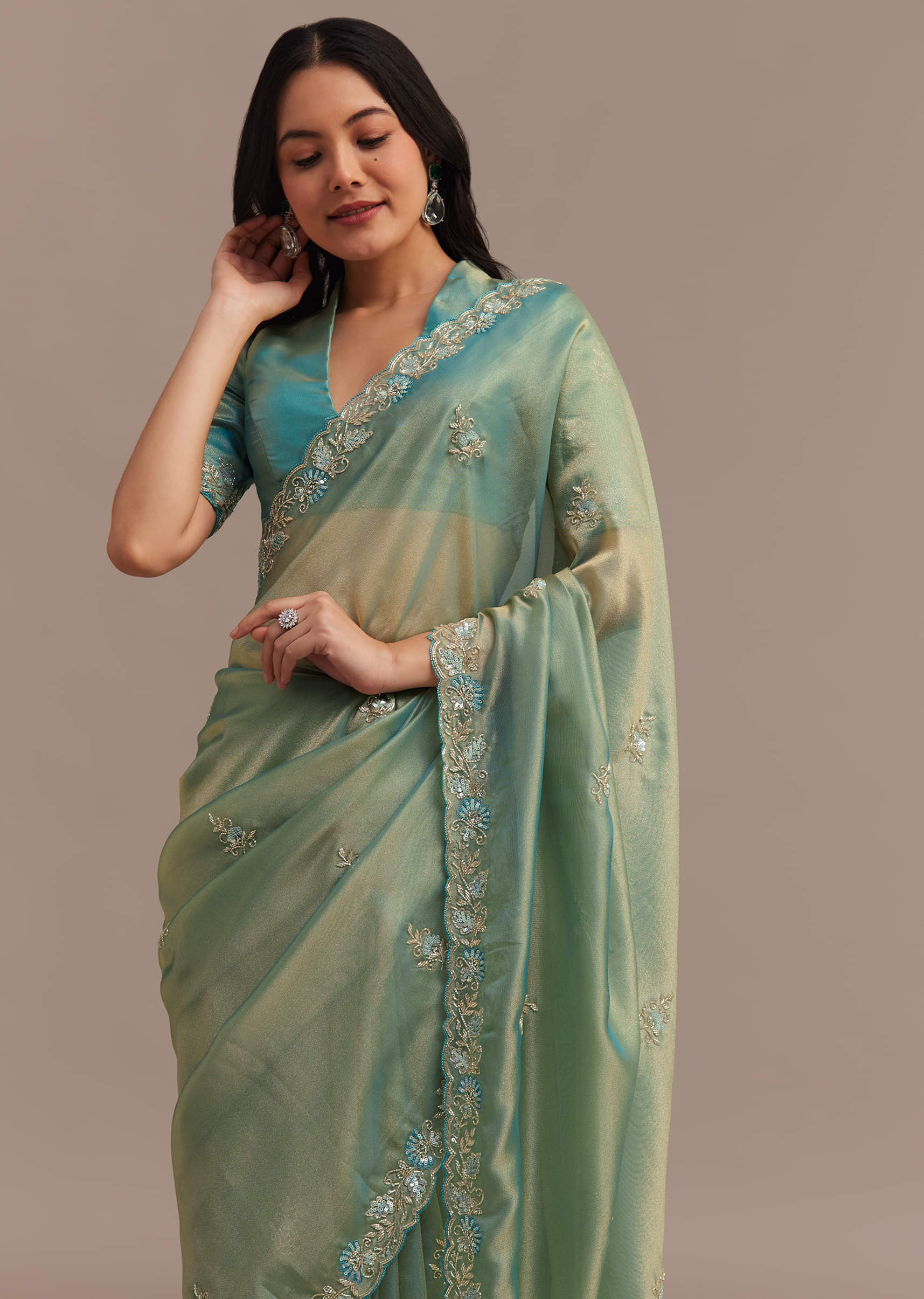 Grace meets shimmer in this metallic sea green tissue organza saree enriched with delicate cutdana and sequins embroidery. The sheer elegance of organza blends beautifully with the luminous fabric creating a mesmerizing drape. Its intricately adorned border and pallu elevate the design making it perfect for weddings receptions and grand festivities. A sophisticated choice for those who appreciate timeless craftsmanship with a modern touch.Awarded as the Most Trusted Brand we're delivering styles you love just as promised.