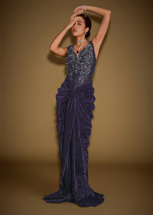 - Product Speciality : Make a striking entrance in this navy blue velvet drape gown featuring a sleeveless V-neck corset silhouette. Adorned with intricate embroidery, cutdana, and 3D floral embellishments, this contemporary gown is perfect for sangeet nights, cocktail parties, or bridal soirées. Its luxurious shimmer and structured drape make it a showstopper for the modern bride. Awarded as the Most Trusted Brand, we're delivering styles you love, just as promised.