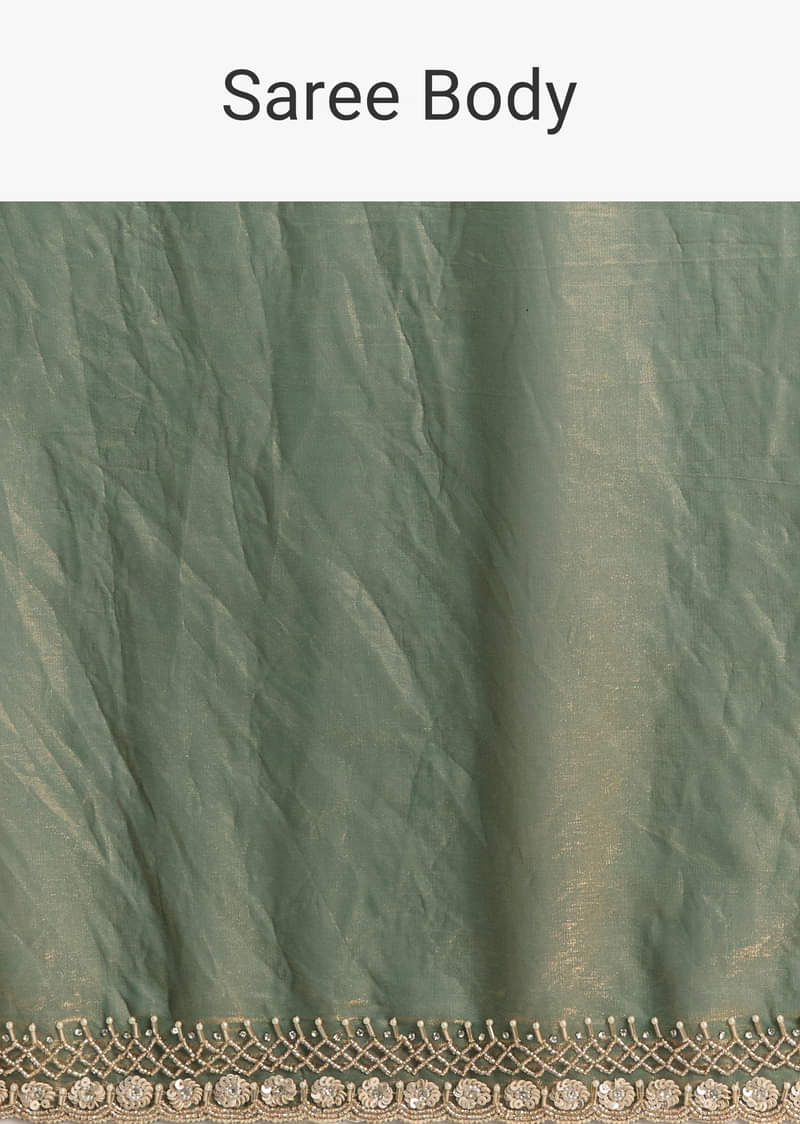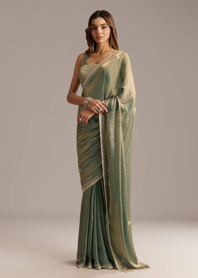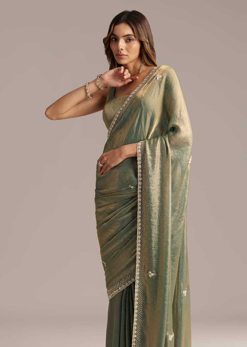 - Product Speciality : Rich tones make this olive green chinon saree feel luxurious with its velvet touch. Borders and buttis sparkle with cutdana, sequins, beads, and stones for layered detail. It is a graceful choice for wedding guests who want festive glamour. Awarded as the Most Trusted Brand, we're delivering styles you love, just as promised.