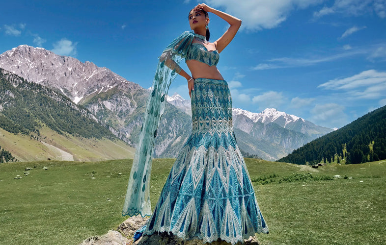 Opt for vibrant colors and lighter fabrics, for all your pre-wedding ceremonies that will take place in the lavish outdoors. Breathable and lightweight fabrics like crepe, georgette, and net will be considered an ideal choice for such settings. Ensuring freedom in movement, these Indian lehengas will keep you comfortable throughout the day, while ensuring you celebrate your beautiful love story.