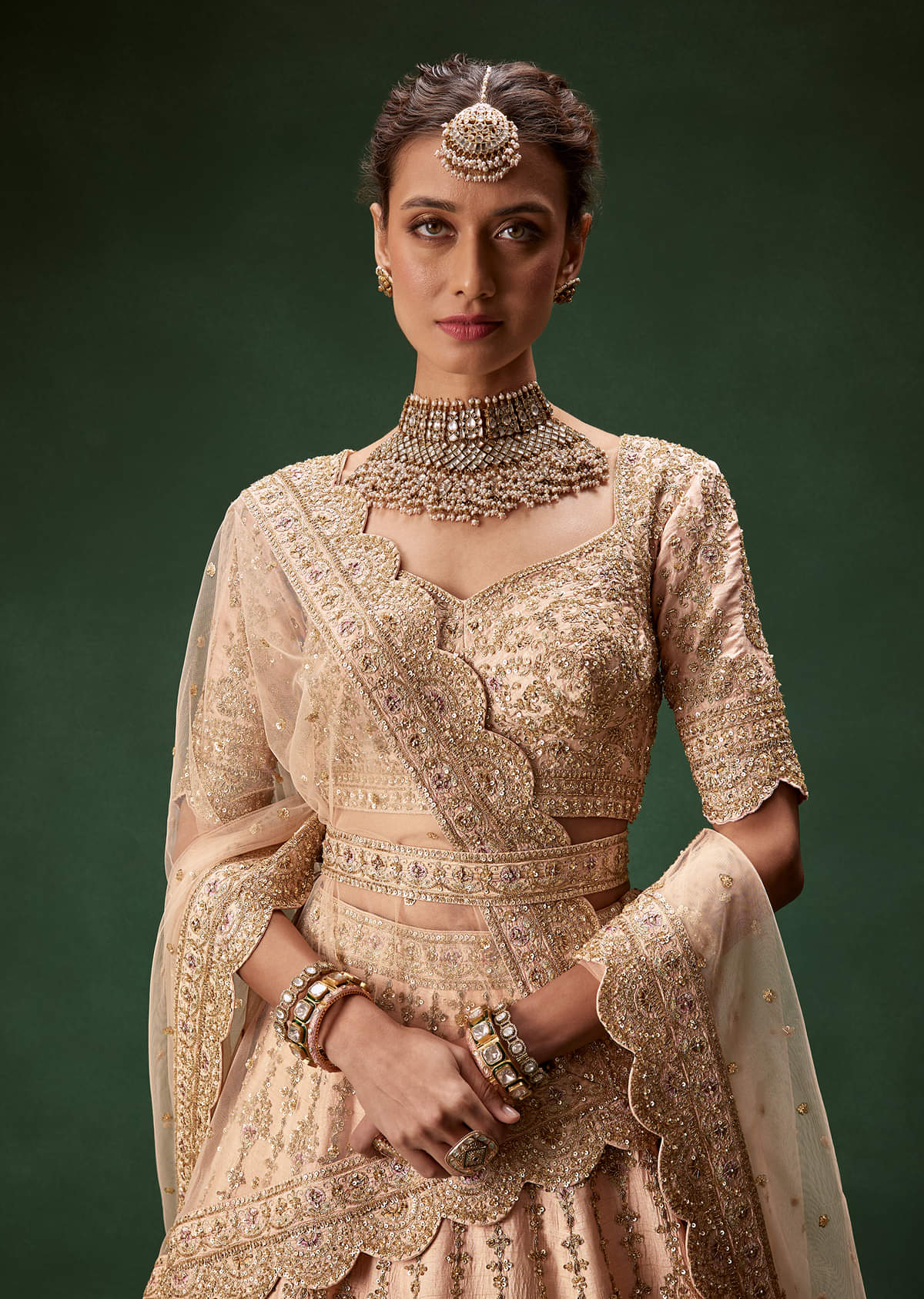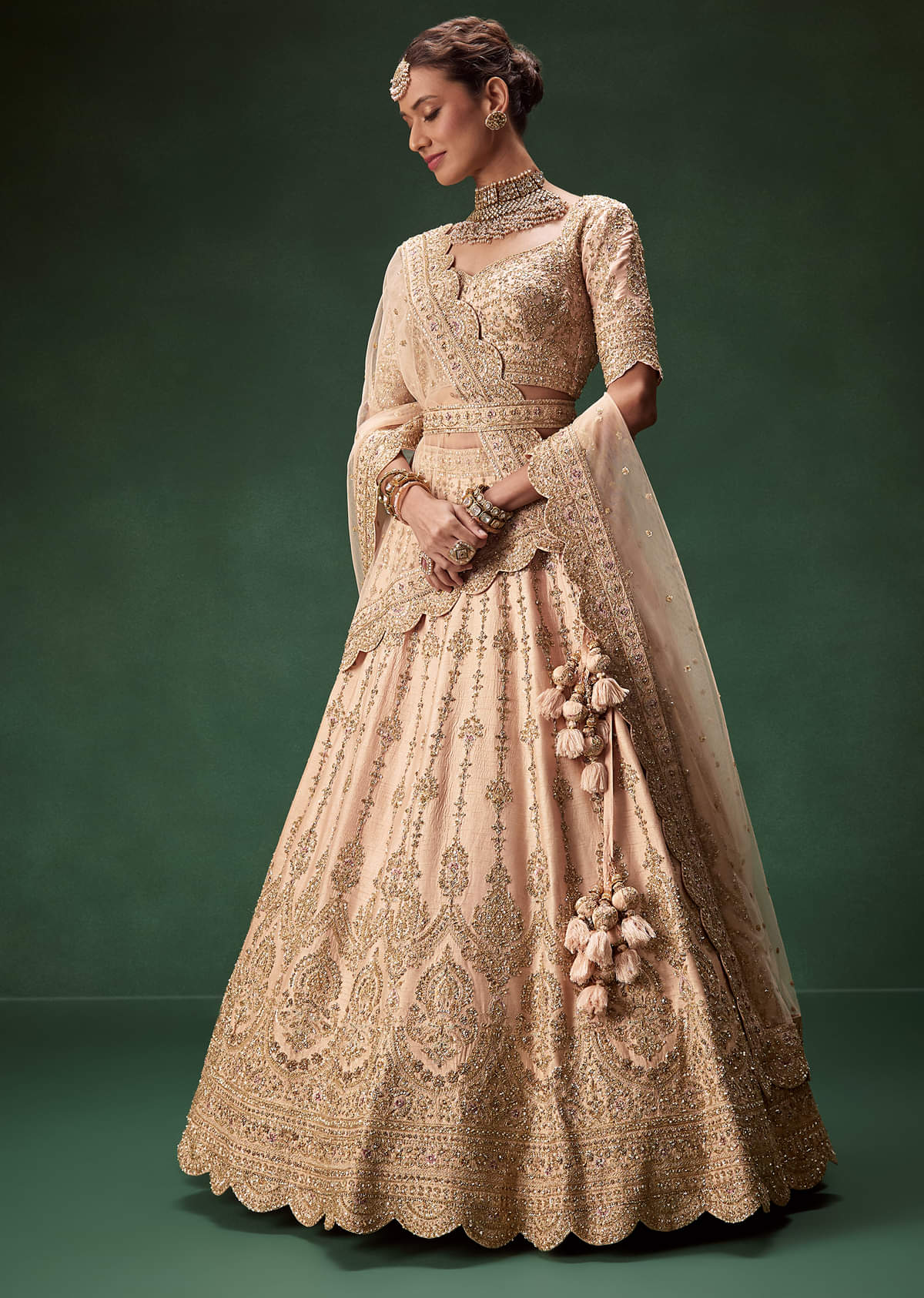 - Product Speciality : Elegant and graceful this lehenga features thread cut dana sequins and stone embroidery on a soft peach silk base. Styled with a high neck blouse and bordered dupatta it's ideal for brides who want something royal yet delicate.Awarded As The Most Trusted Brand We Re Delivering Styles You Love Just As Promised.