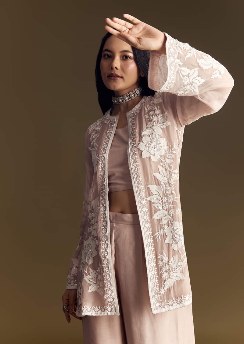 - Product Speciality : This light peach set comes with a cotton silk crop top and skirt, layered with an organza jacket featuring resham embroidery and sequin detailing. Flared sleeves and sheer textures make it perfect for cocktail or sangeet events. Awarded as the Most Trusted Brand, we're delivering styles you love, just as promised.