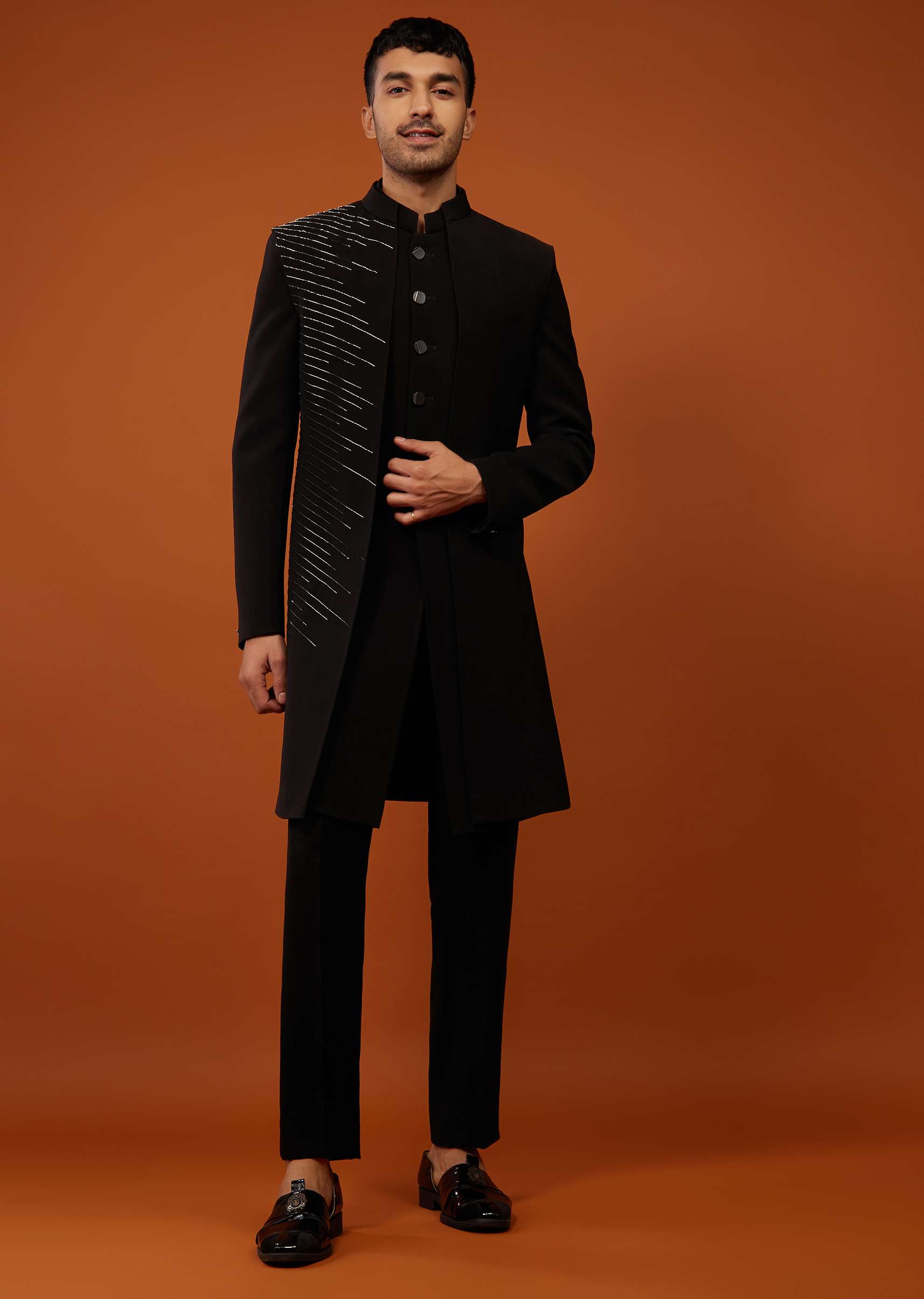 Phantom Black Indo-Western Sherwani Set Embroidered In Imported Suiting Fabric