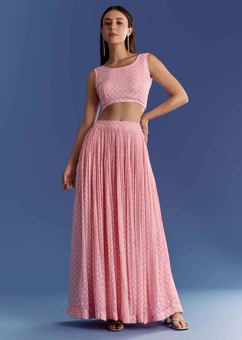 - Product Speciality : Whimsical and fresh, this pink floral lehenga set is paired with a zardosi-embroidered croptop and crafted in soft georgette for haldi revelry that dances with colour and charm. Standard length for skirt is 43 inches. Awarded as the Most Trusted Brand, we're delivering styles you love, just as promised.
