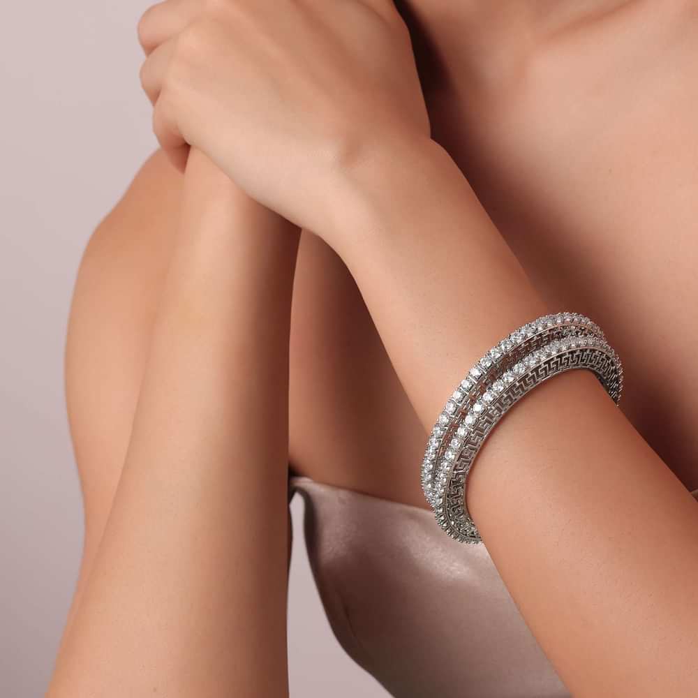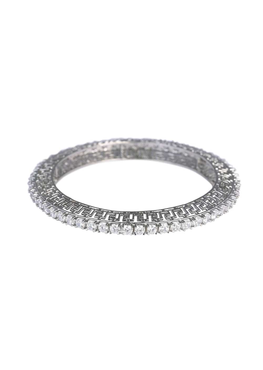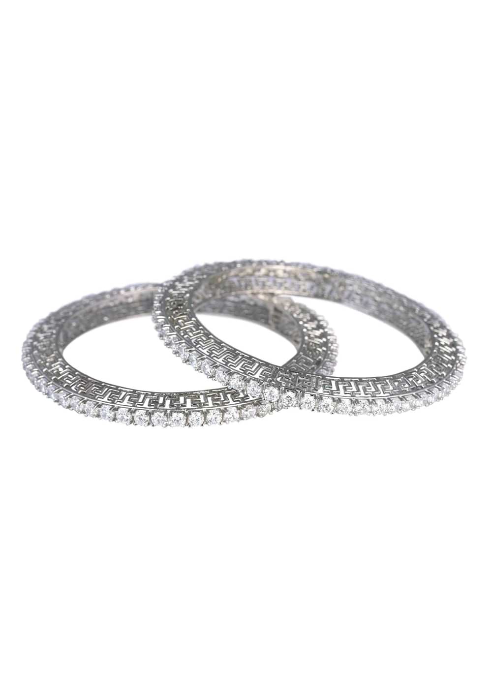 The right amount of twinkle and shine this pair of sterling silver bangles lends a glamorous look. Radianting timeless beauty it is encrusted with zirconia stones. Meticulously crafted this stunning... More Product Details