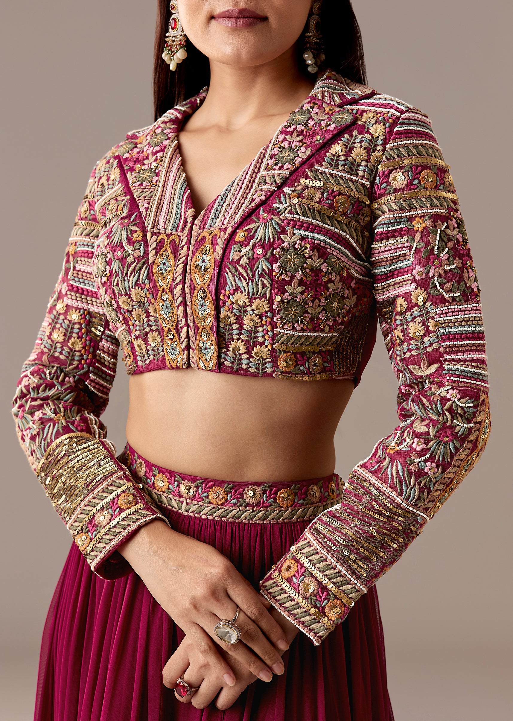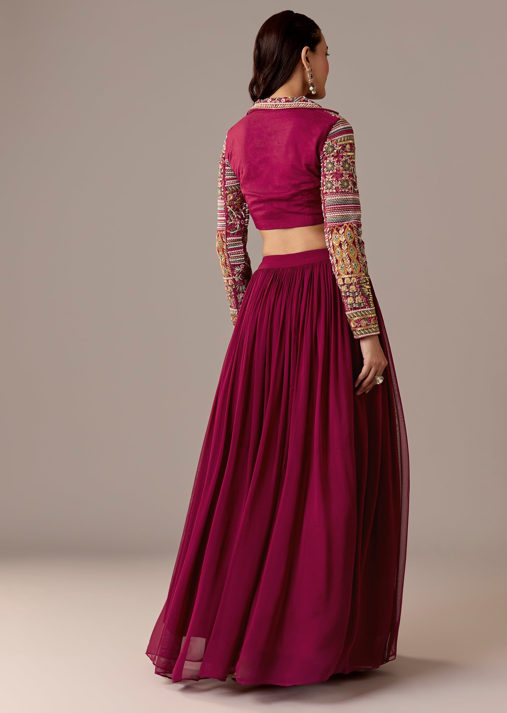 A wine lehenga set featuring a full-sleeve shirt-collar crop top detailed with threadwork, moti, and sequins. Paired with a flared lehenga and side zip—ideal for haldi, mehendi, and sangeet events.Awarded... More Product Details