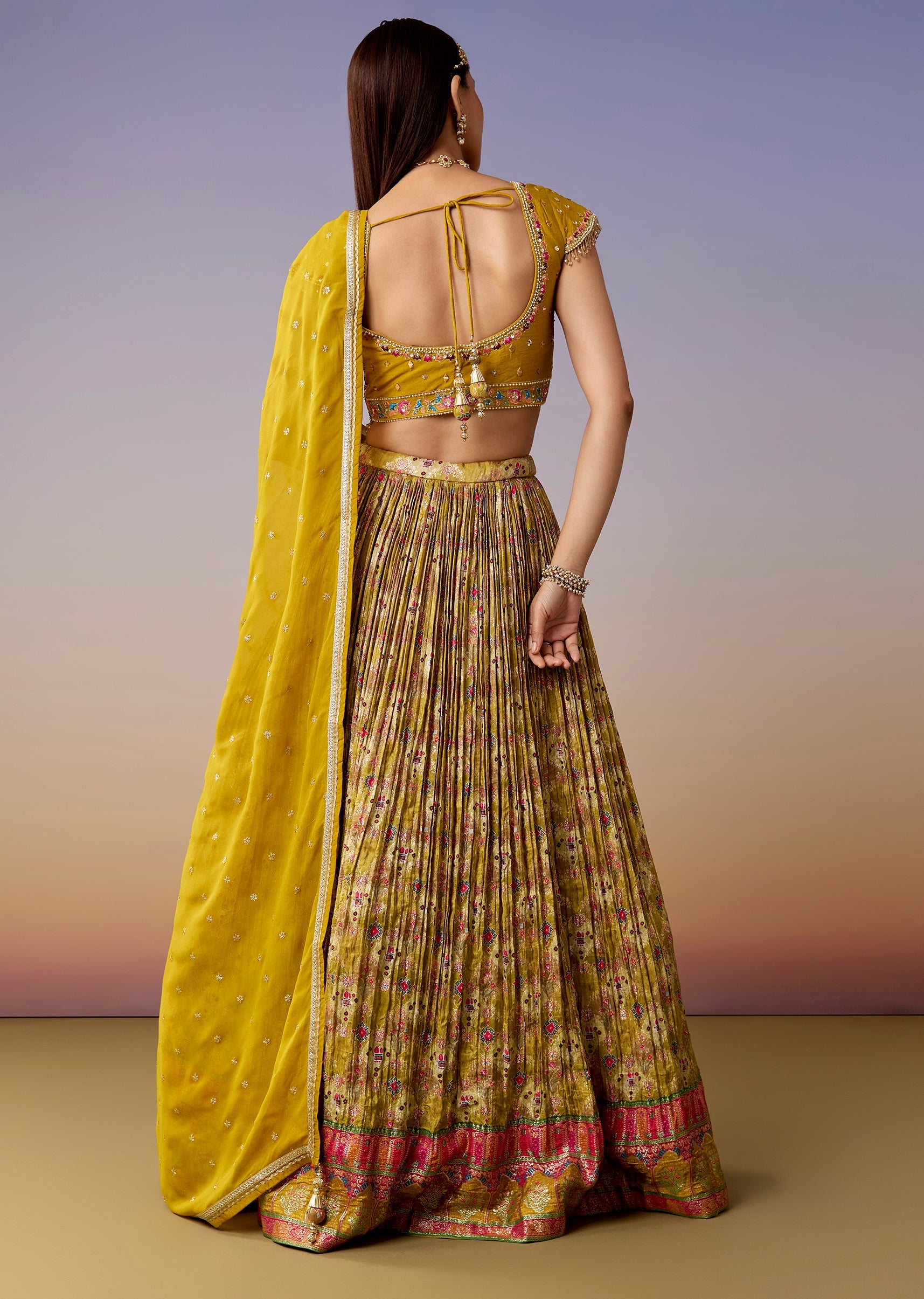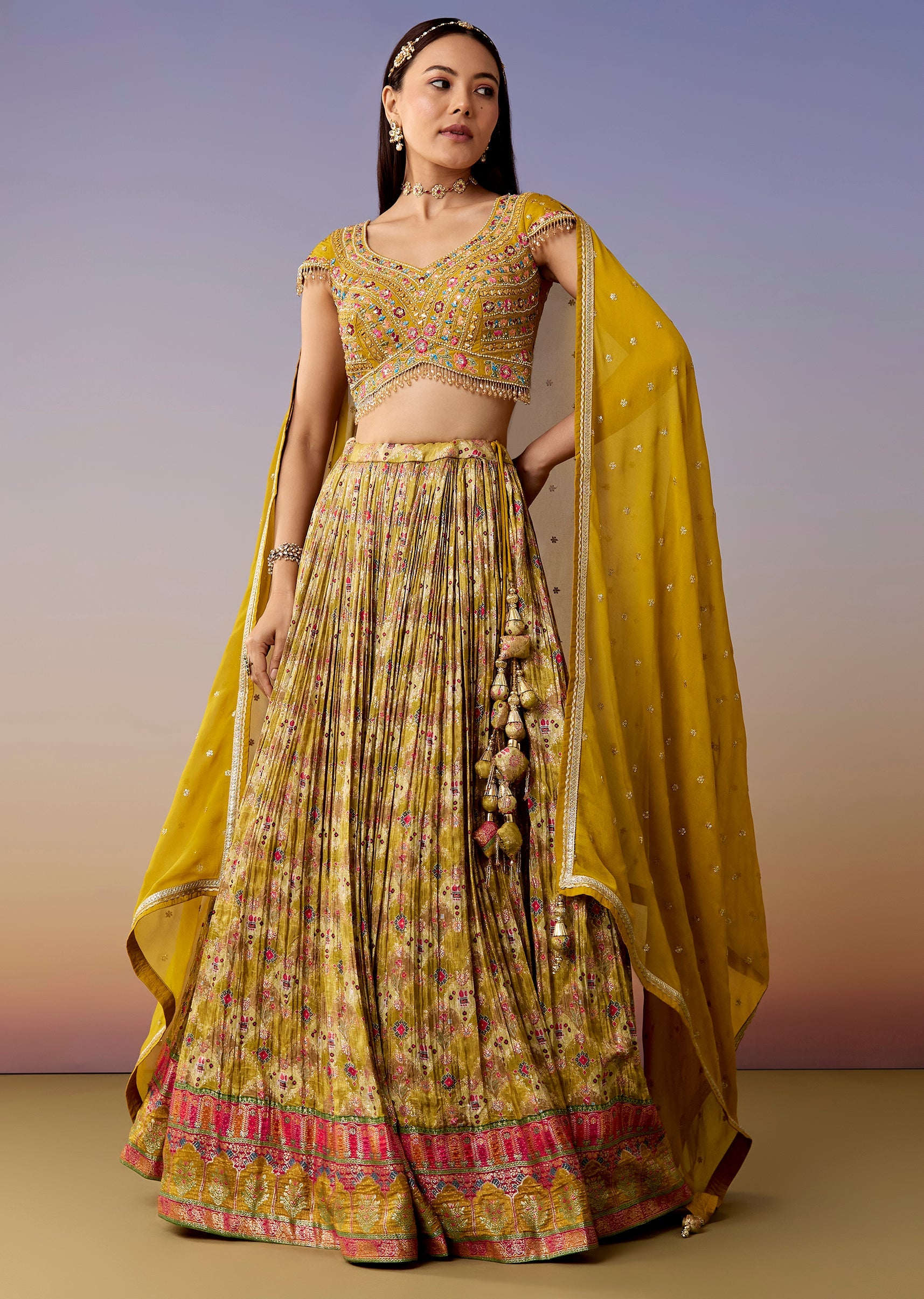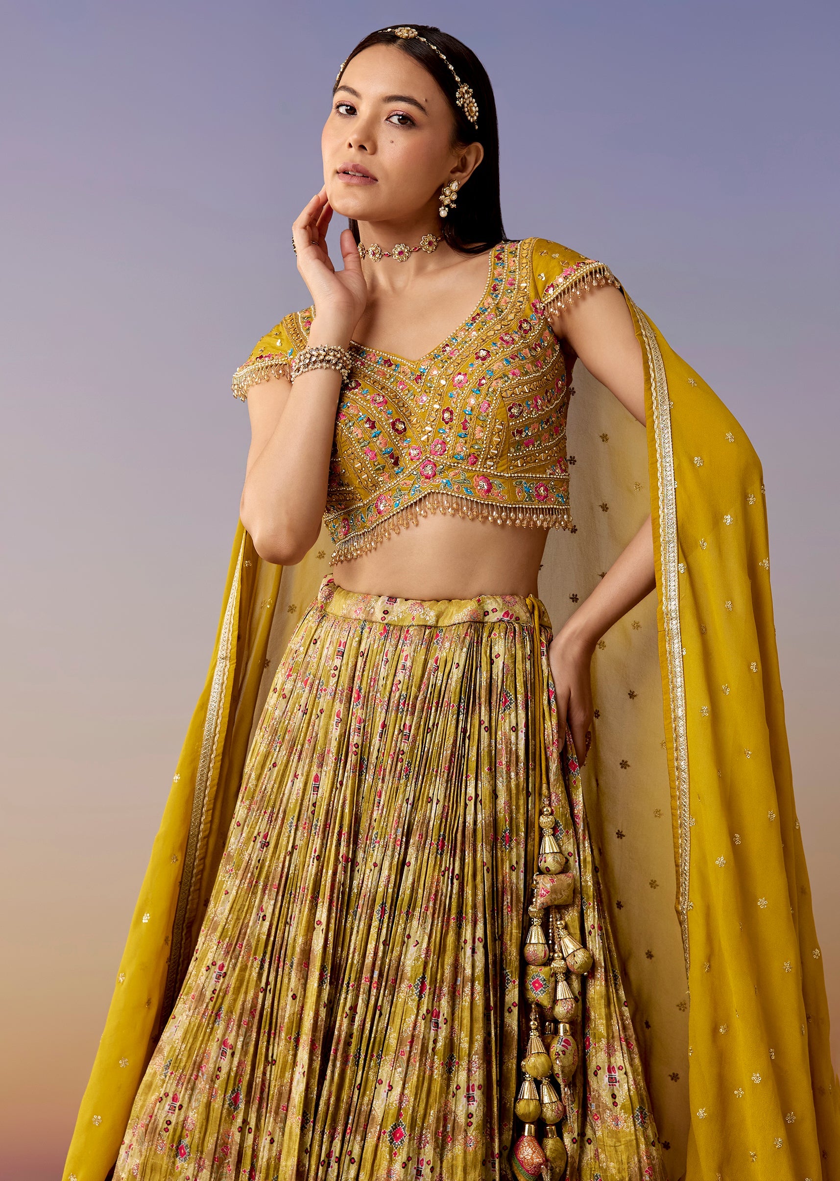 A bright yellow printed lehenga set featuring a cap-sleeve V-neck choli with mirror and resham embroidery, paired with a flared jacquard printed lehenga and dupatta. Great for wedding, haldi, and mehendi events. Awarded as the Most Trusted Brand, we're delivering styles you love, just as promised.
