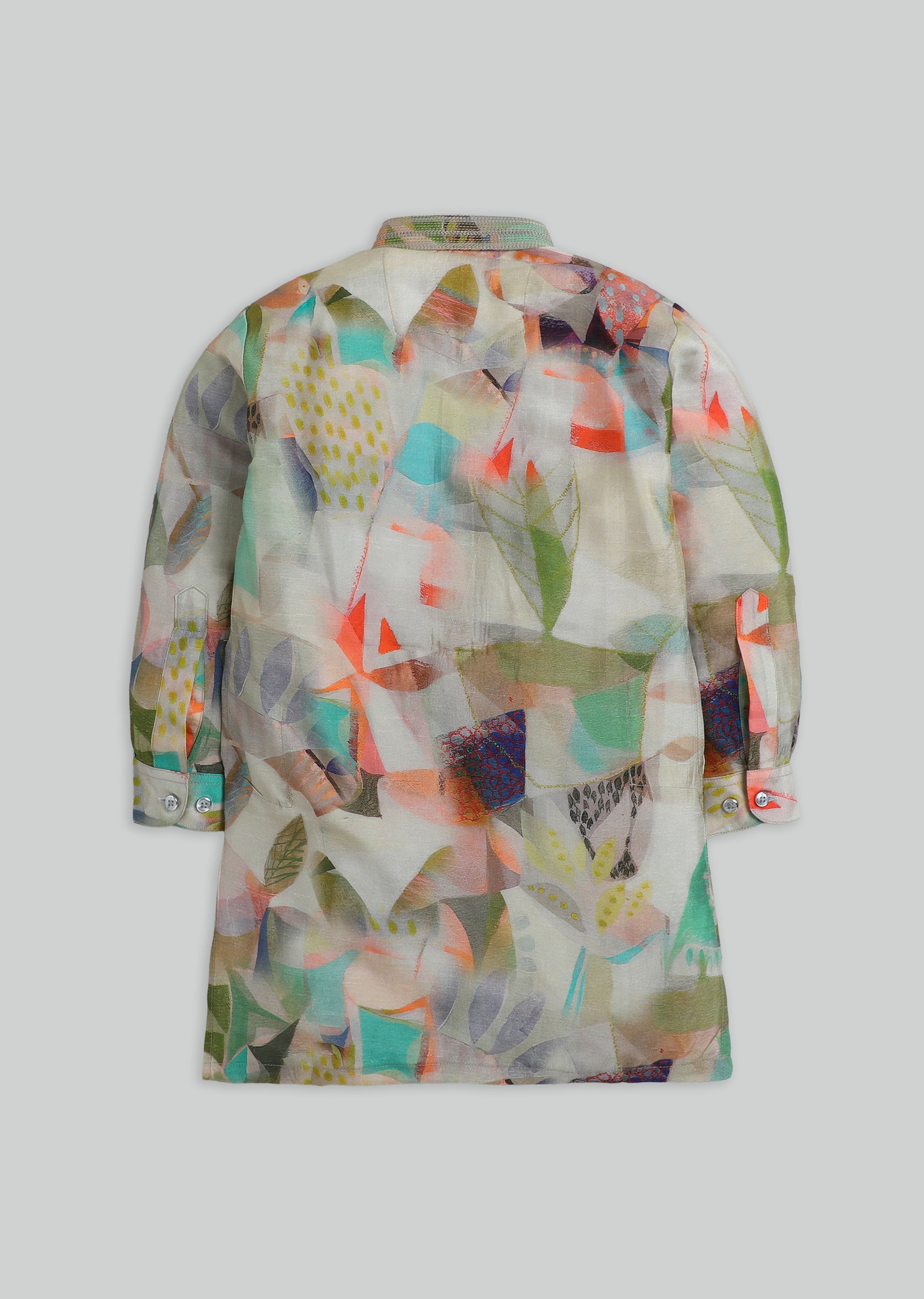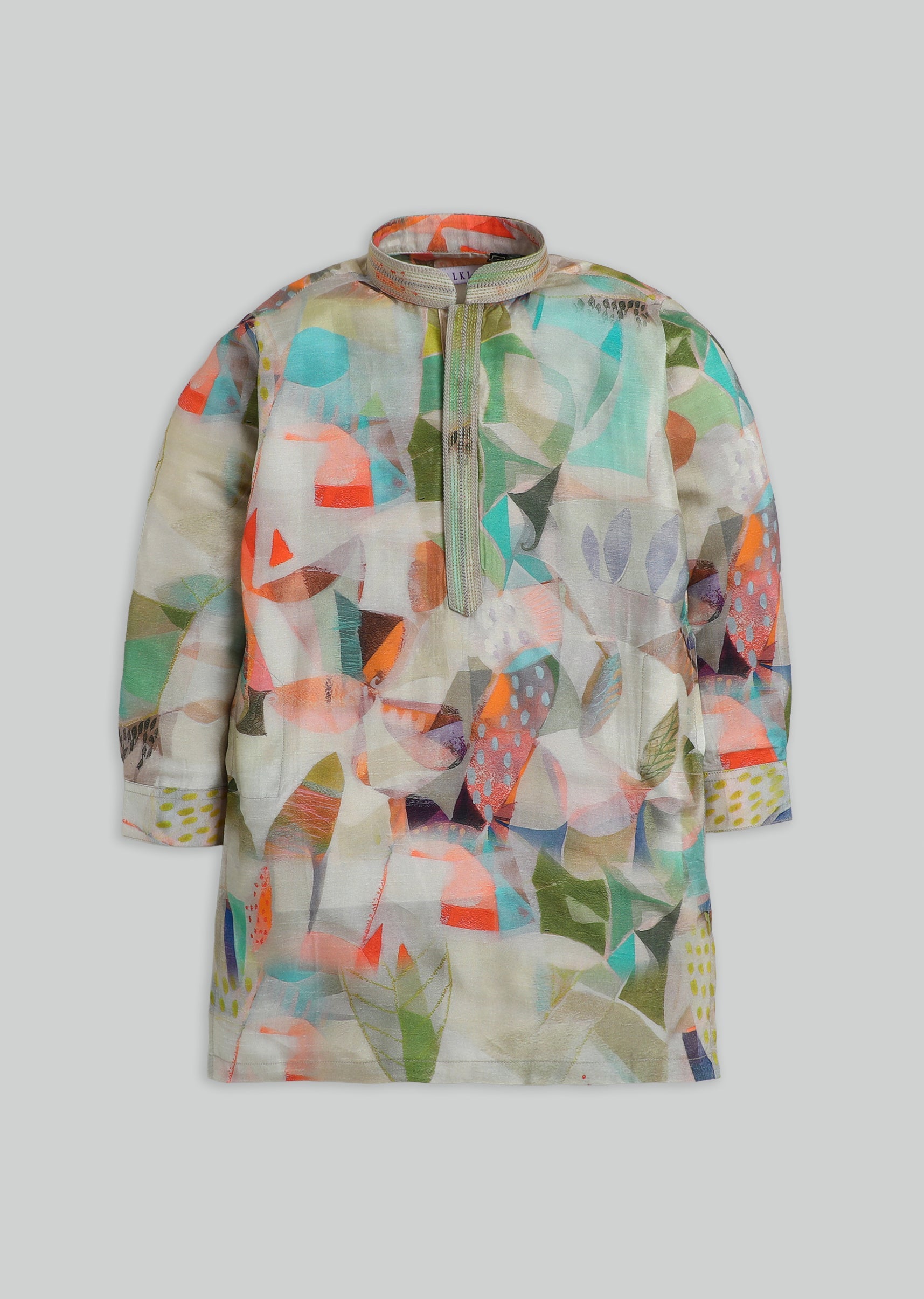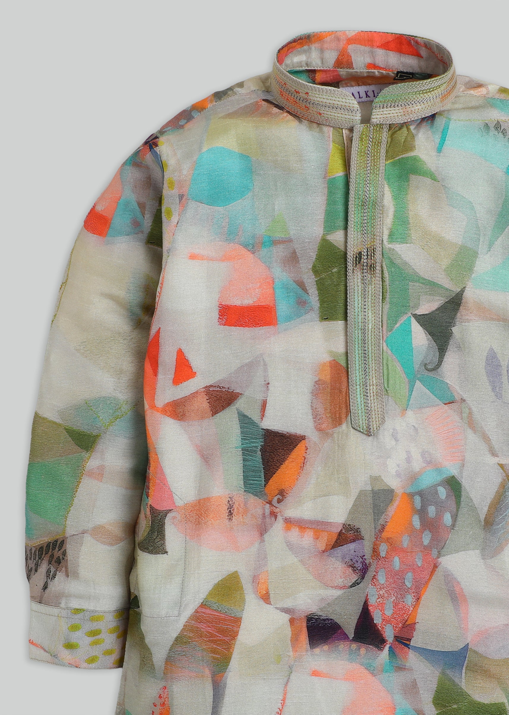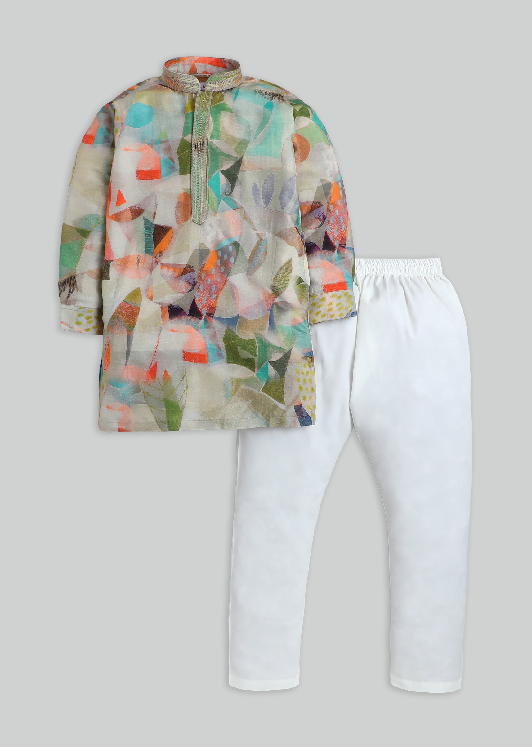 A pastel-friendly cotton kurta set with abstract print detailing, styled with a mandarin collar, 3/4th sleeves and button front. Comes with matching pants—perfect for festive get-togethers. Awarded as the Most... More Product Details