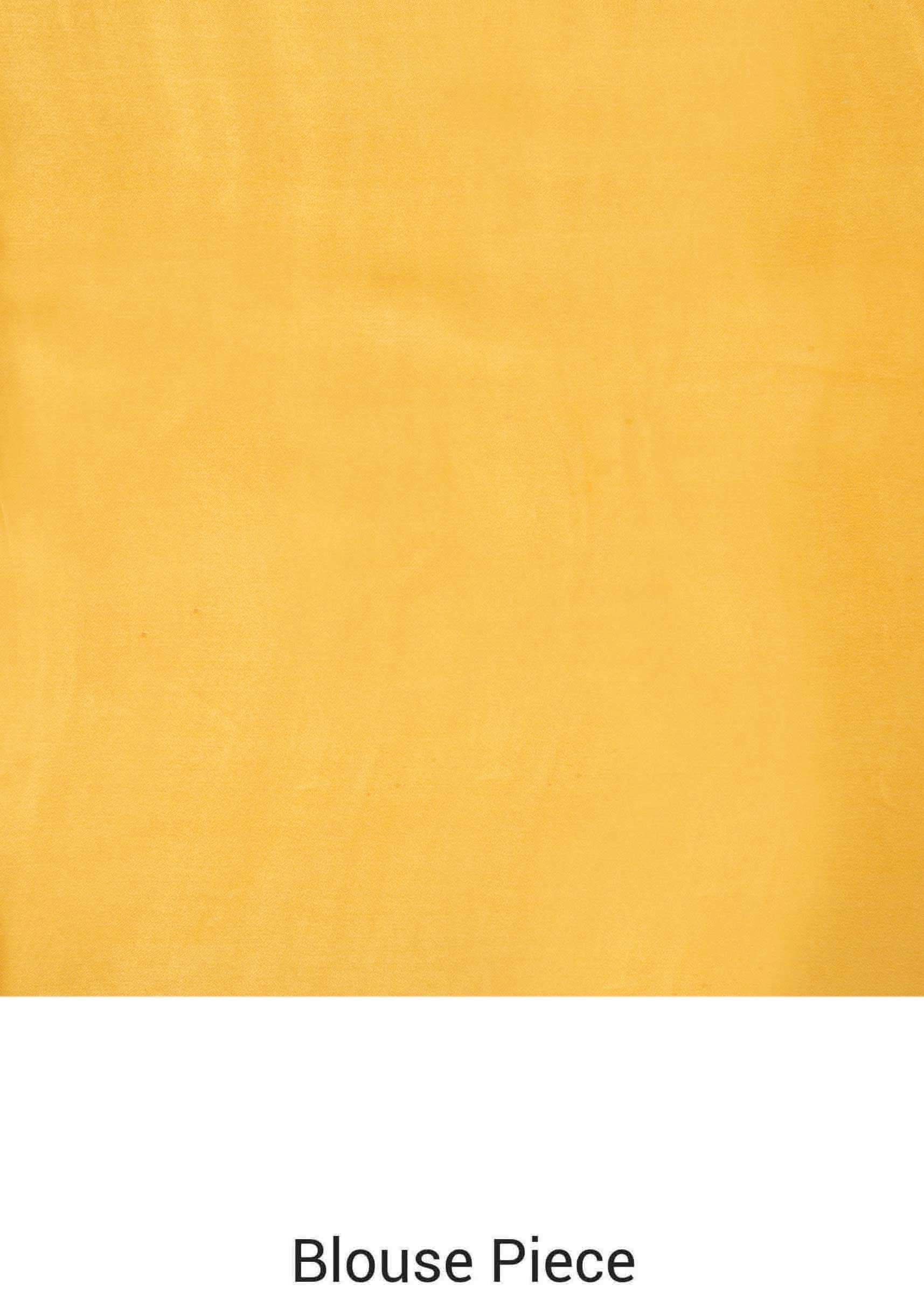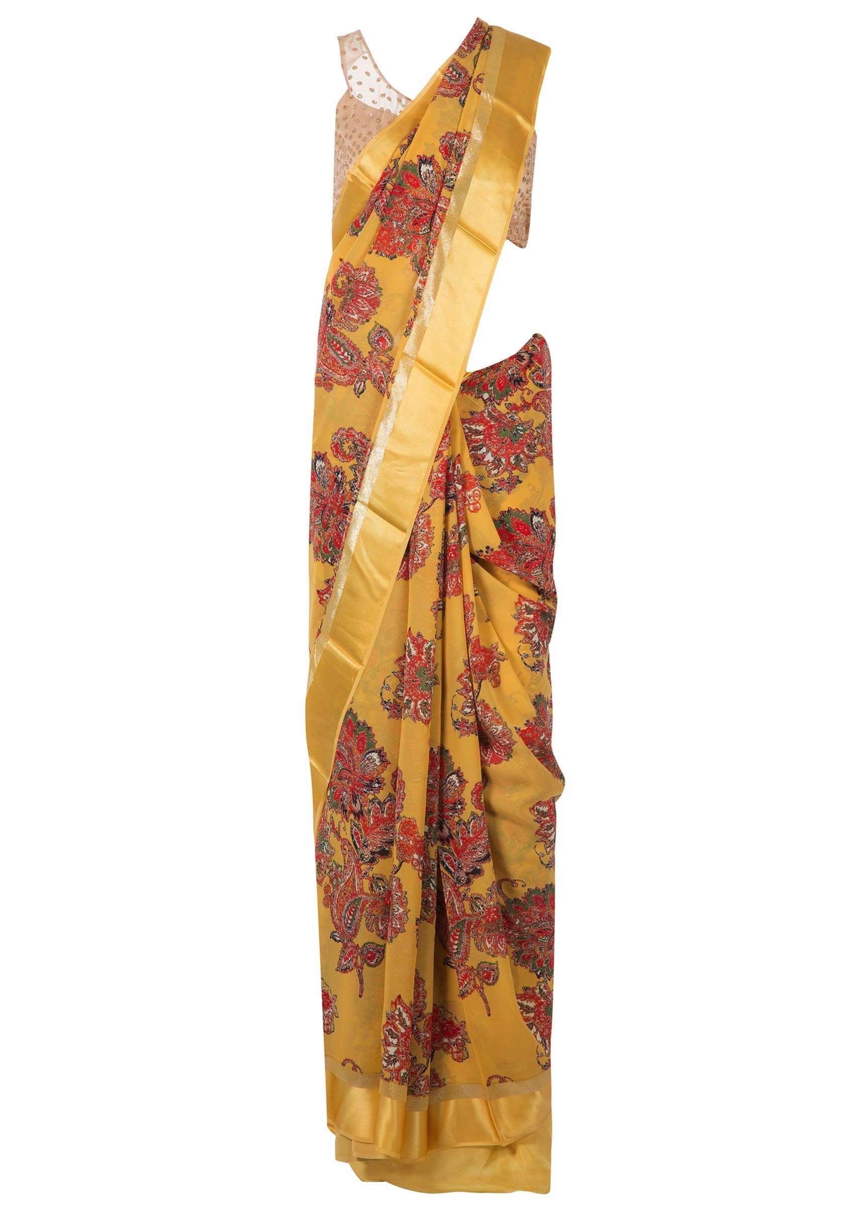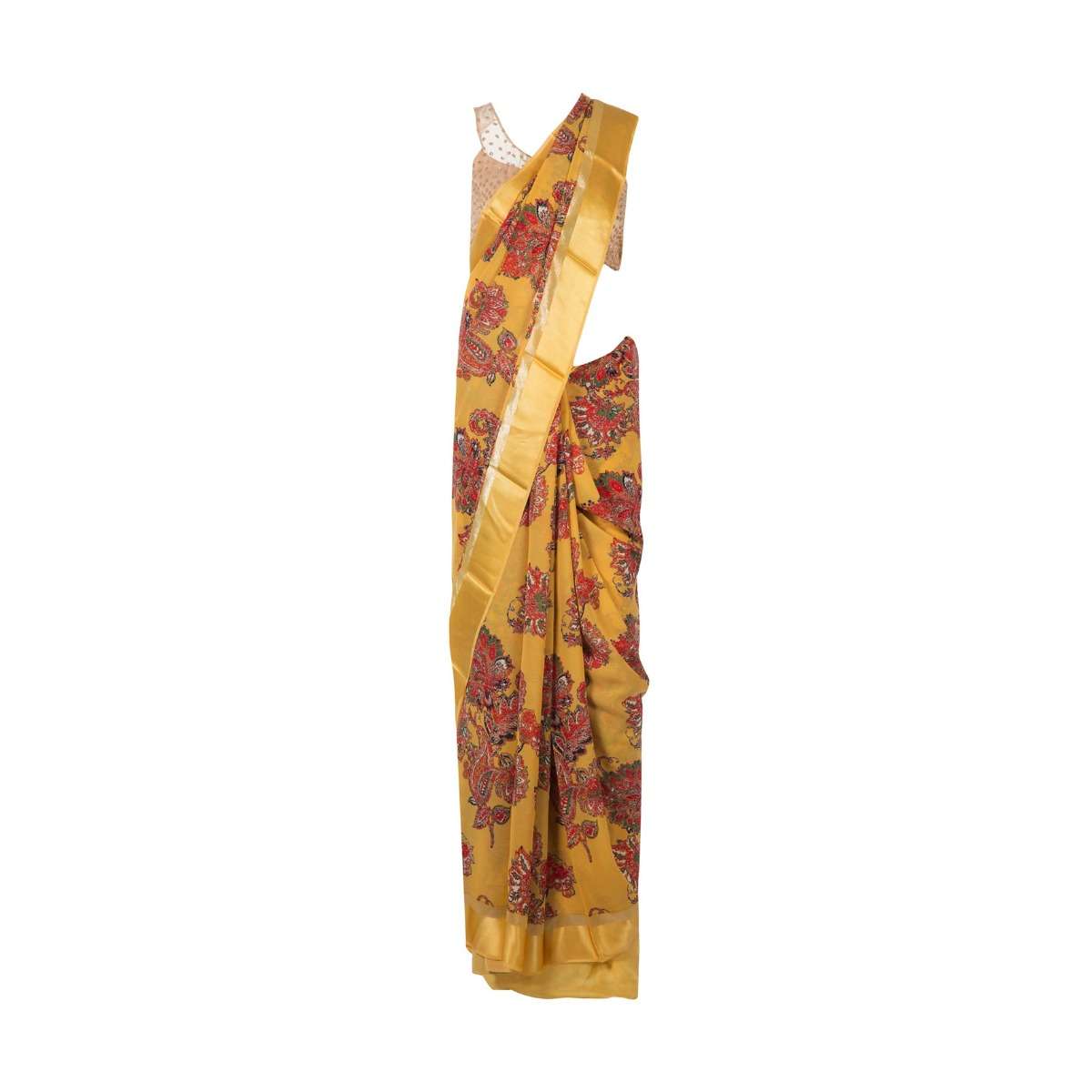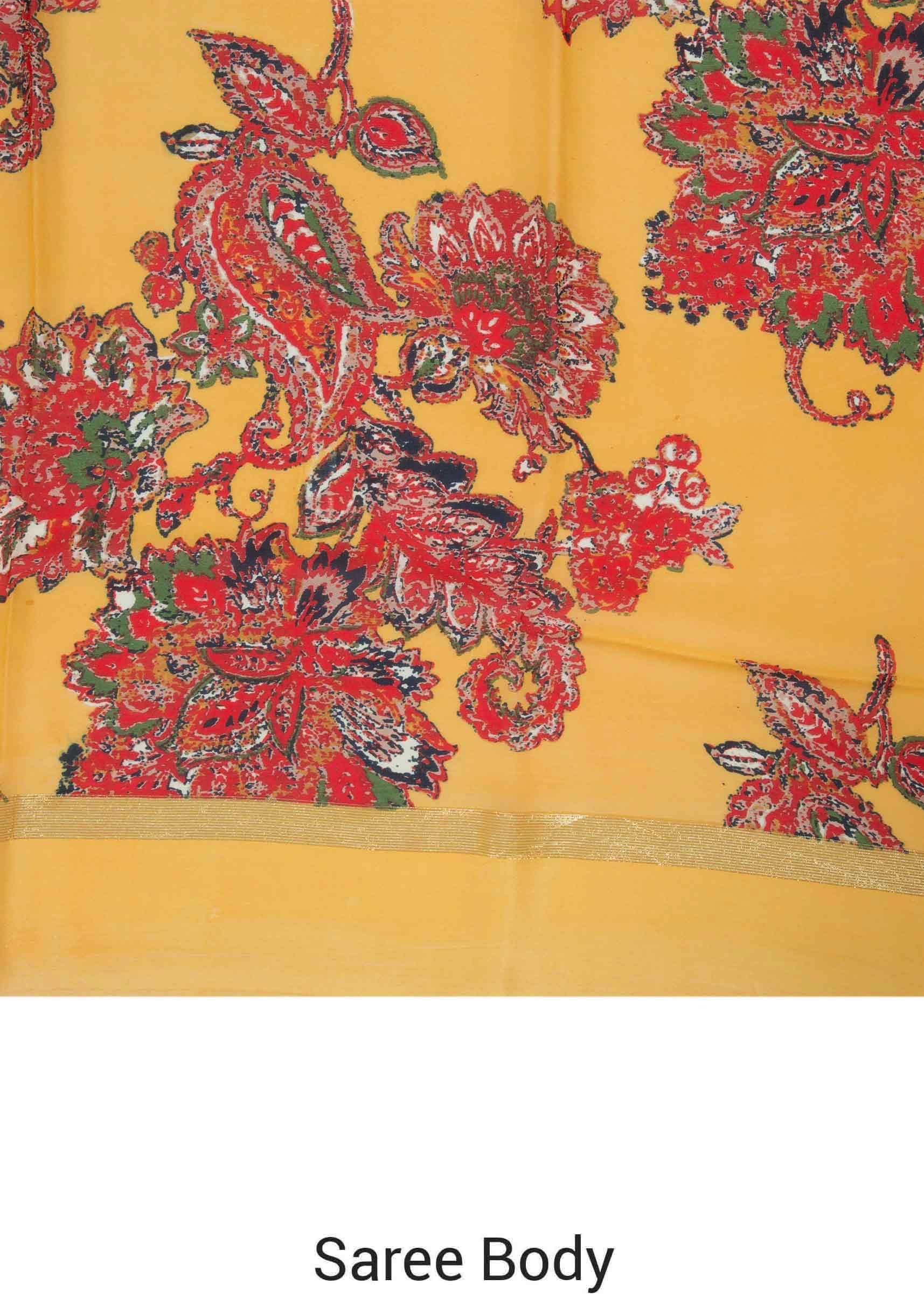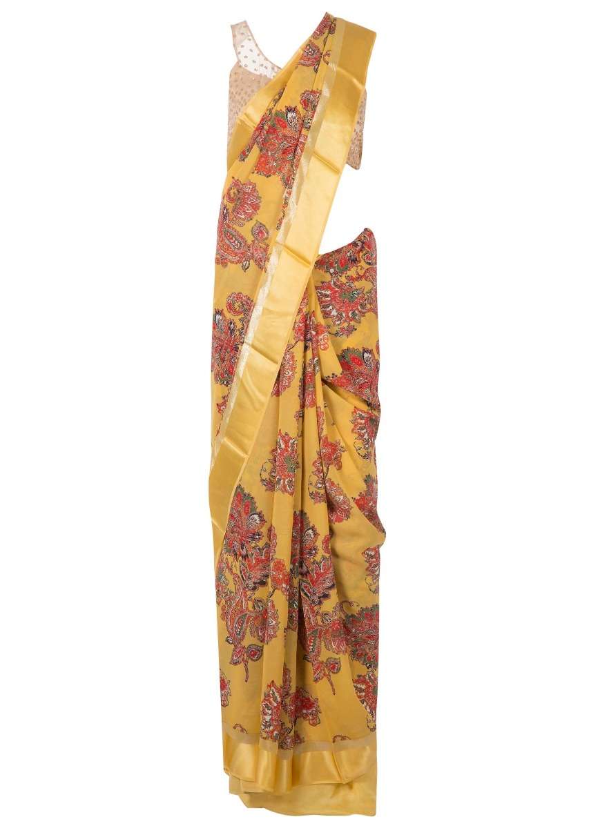 Amber yellow saree in satin with big floral print only on Kalki