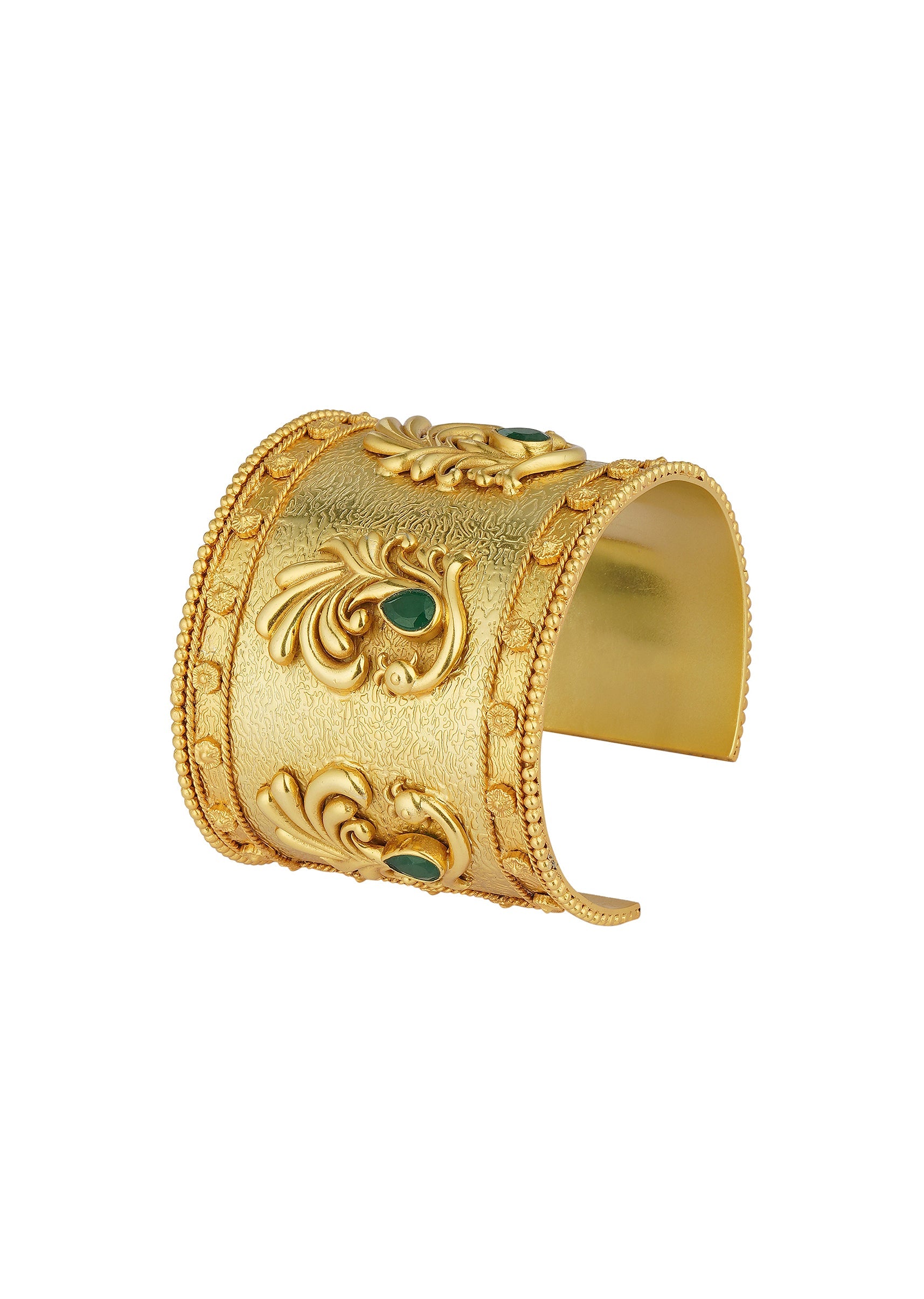 This Antique Gold Cuff Bracelet Features Intricate Peacock Motifs Adorned With Vibrant Green Zircon Stones. The Wide Design Crafted In Mix Metal Combines Bold Elegance With Traditional Craftsmanship. Its Intricate Detailing And Luminous Finish Make It An Ideal Accessory For Festive Celebrations And Grand Occasions.Awarded As The Most Trusted Brand We'Re Delivering Styles You Love Just As Promised.